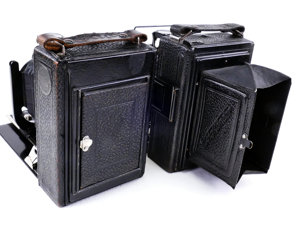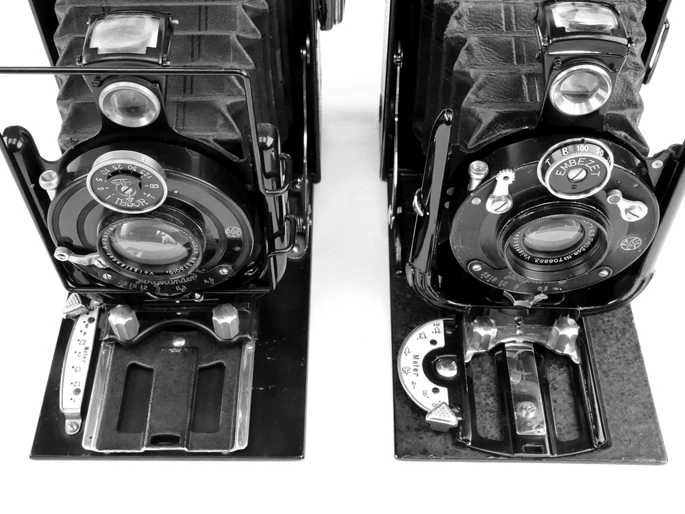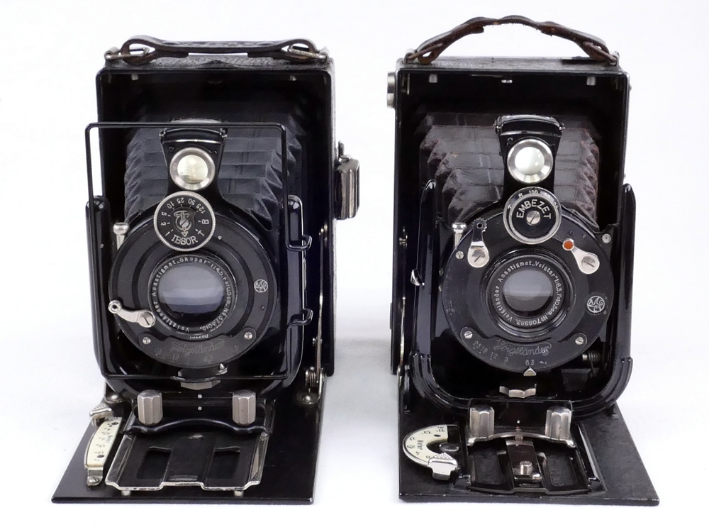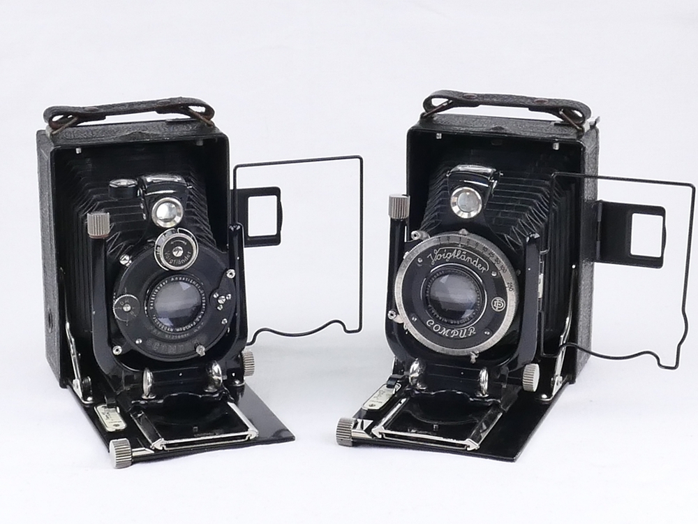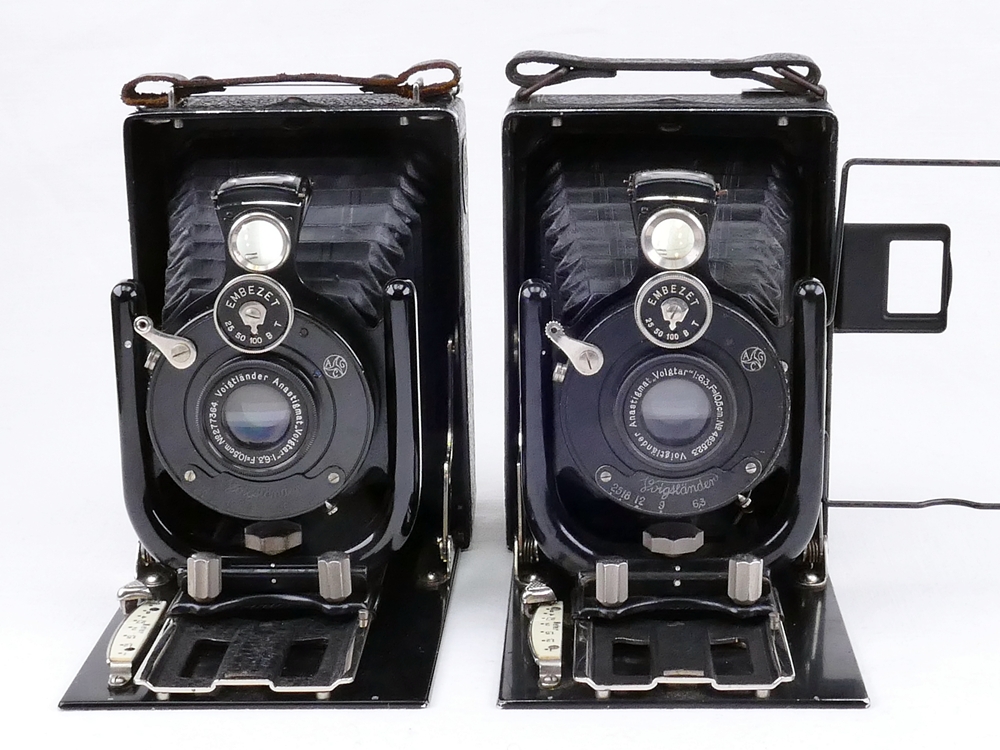 AVUS 6,5 x 9 cm Links erstes Modell 1927 - 1933, rechts zweites Modell 1933 - 1935. Objektive Anastigmat "Skopar" 4.5 / 10.5 cm. |