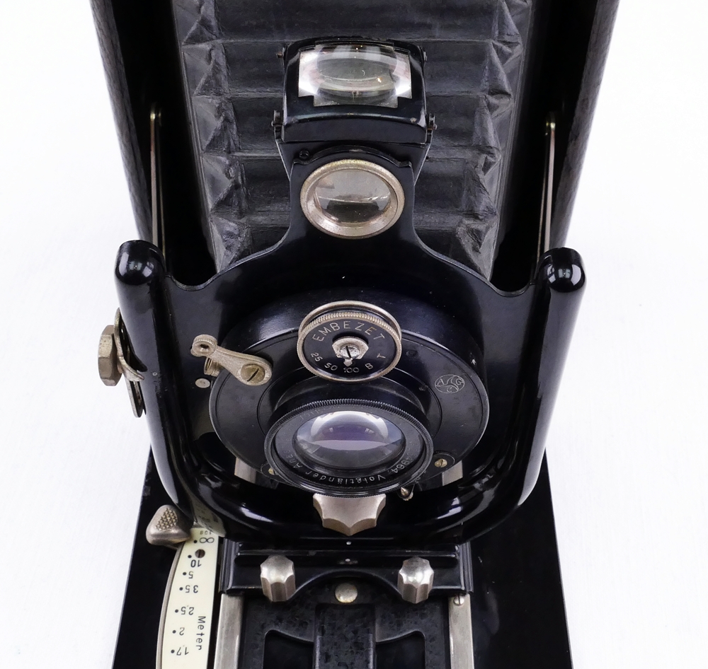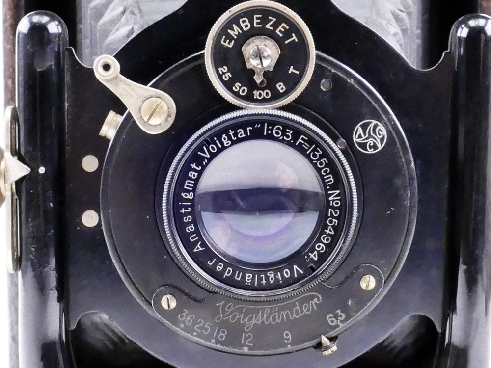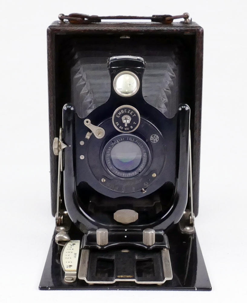 VAG 9 x 12 cm Frühes Modell mit Holzgehäuse. Baujahr 1926 bis 1928. Objektiv Anastigmat "Voigtar" 6.3 / 13.5 cm. |