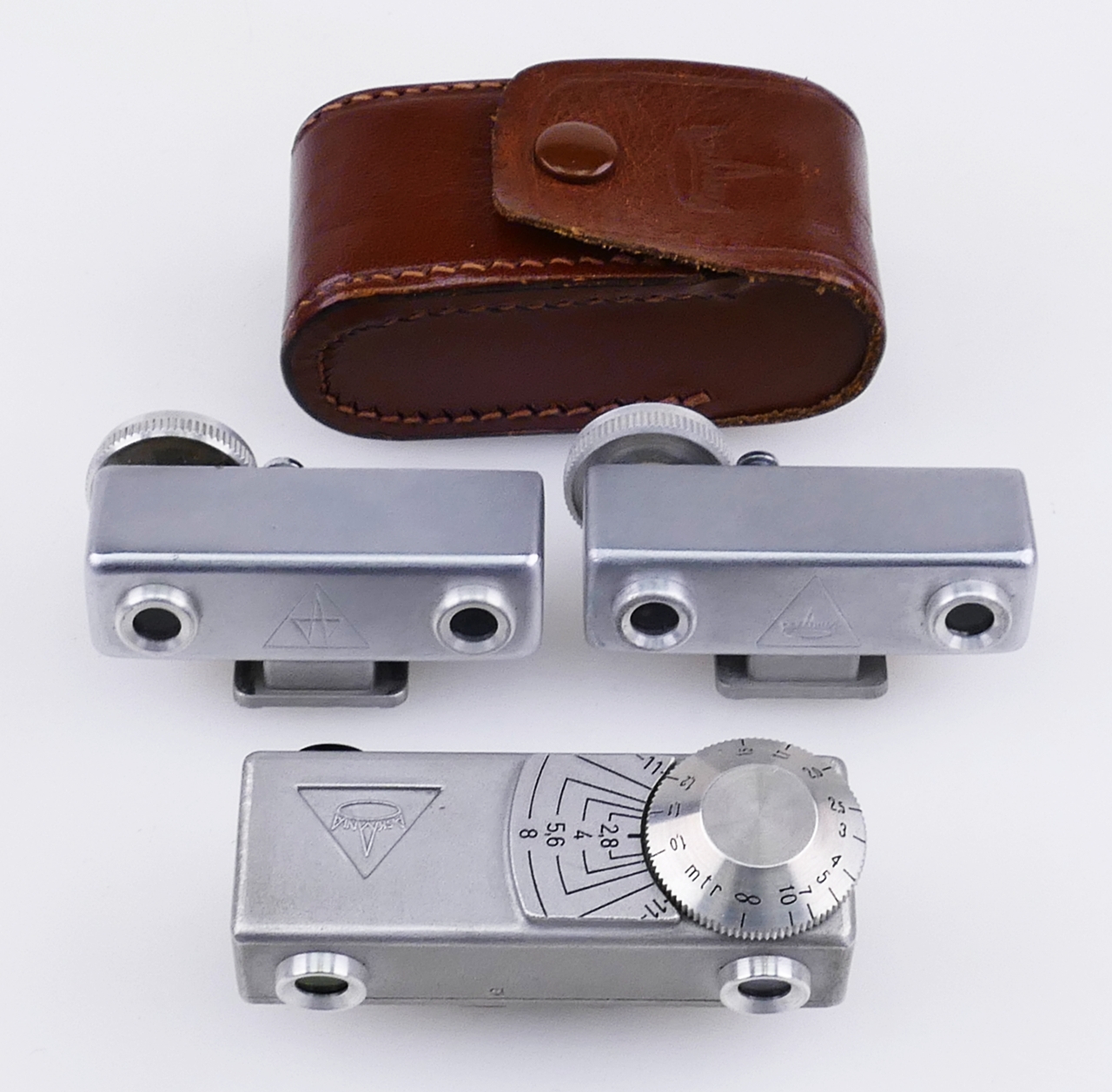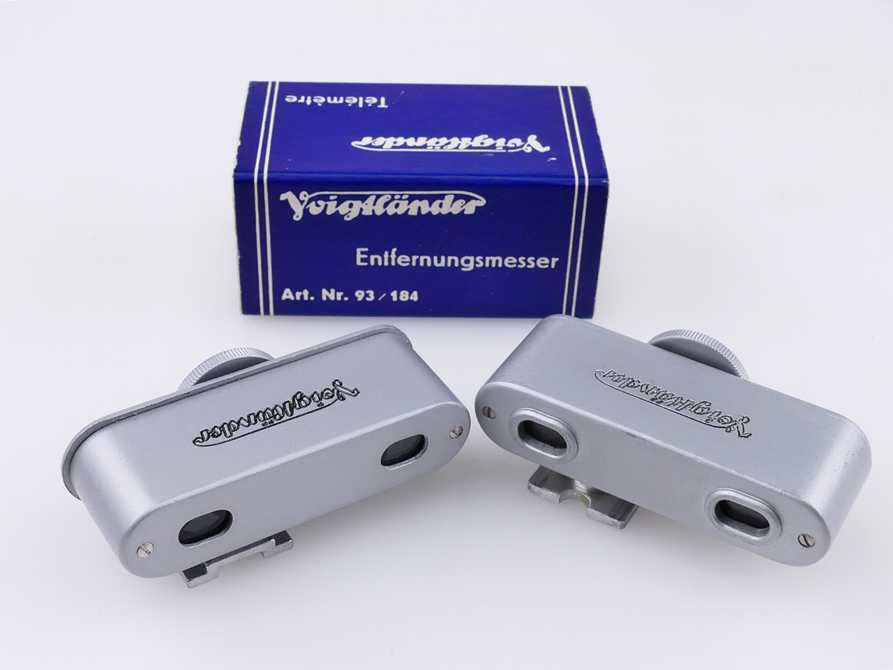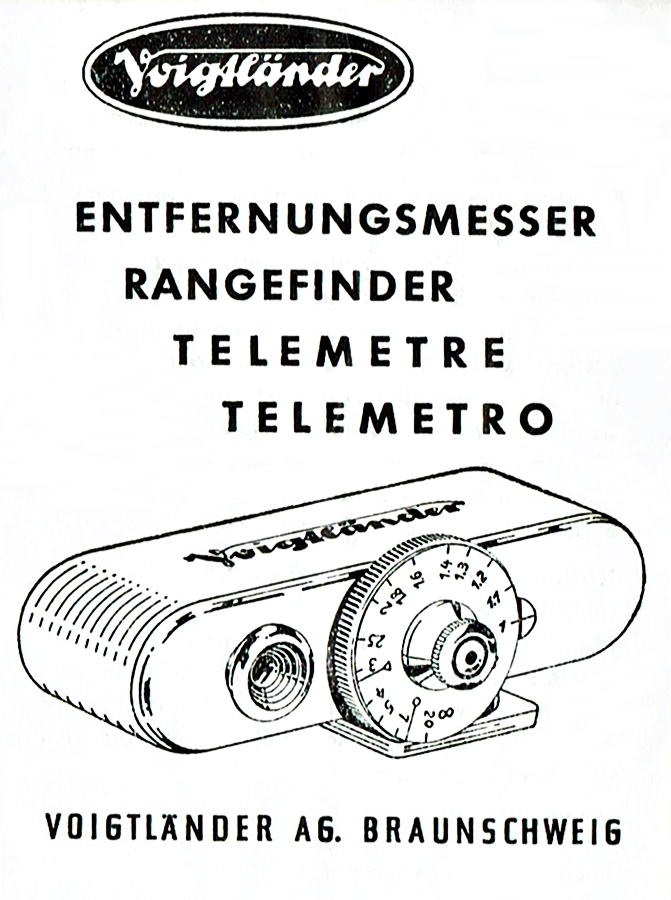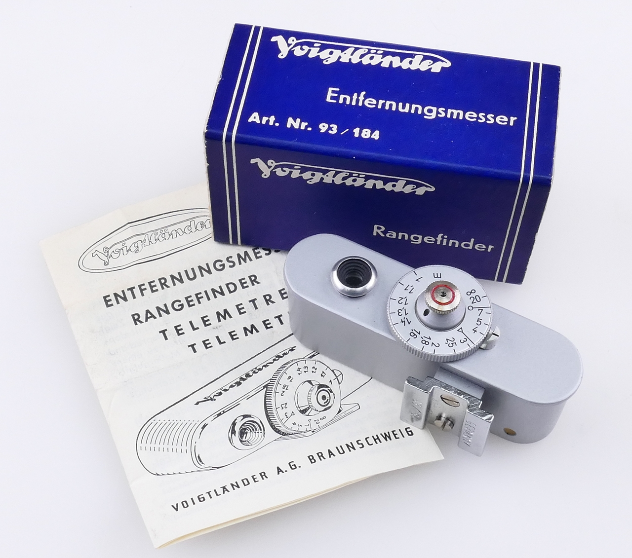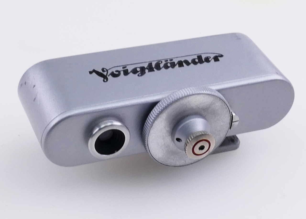 ![]() Voigtländer Voigtländer baute schon 1933 Rollfilmkameras mit Entfernungsmesser. Die späteren Entfernungsmesser unterschieden sich eher nur im Detail. Alle haben einen seitlich verstzten Befestigungsfuß. Obligatorisch, das schöne Ledertäschchen.