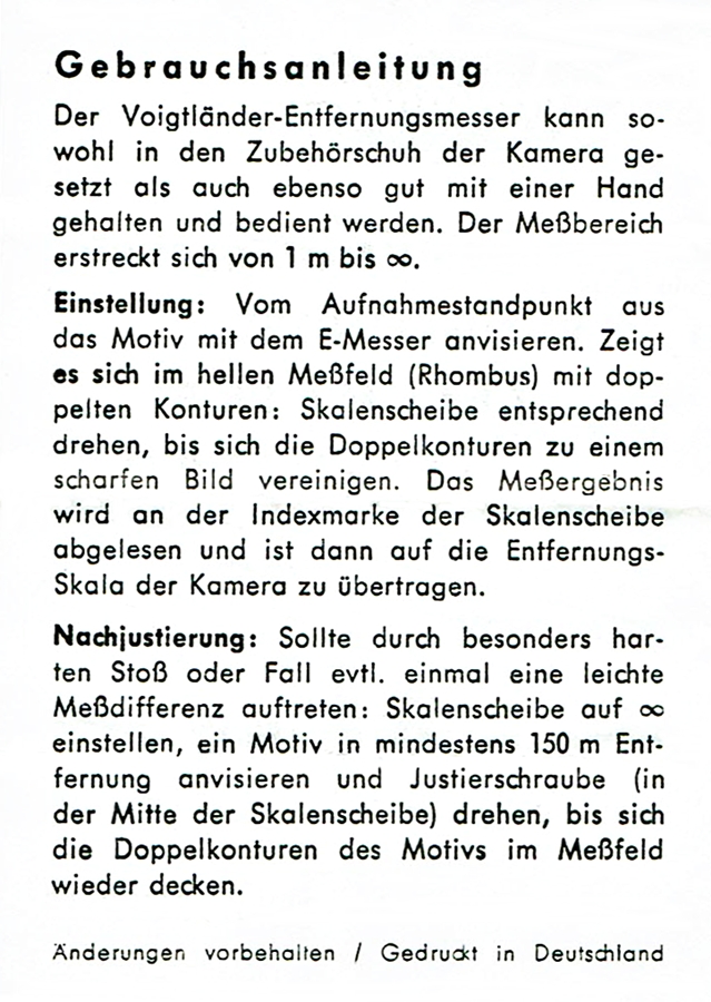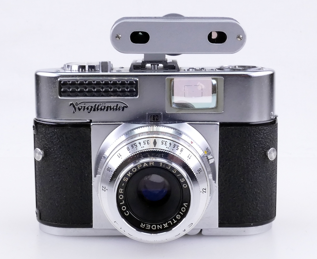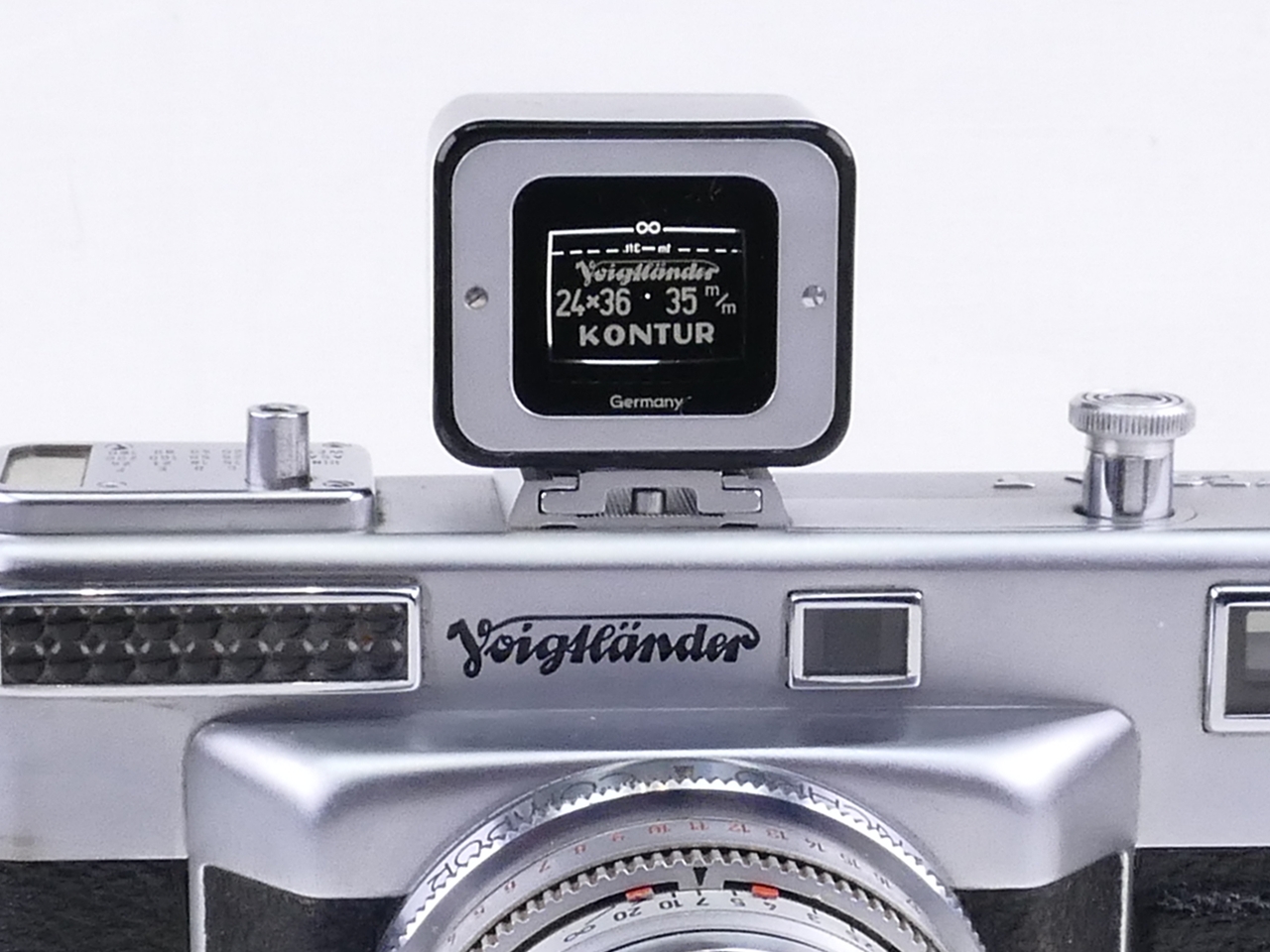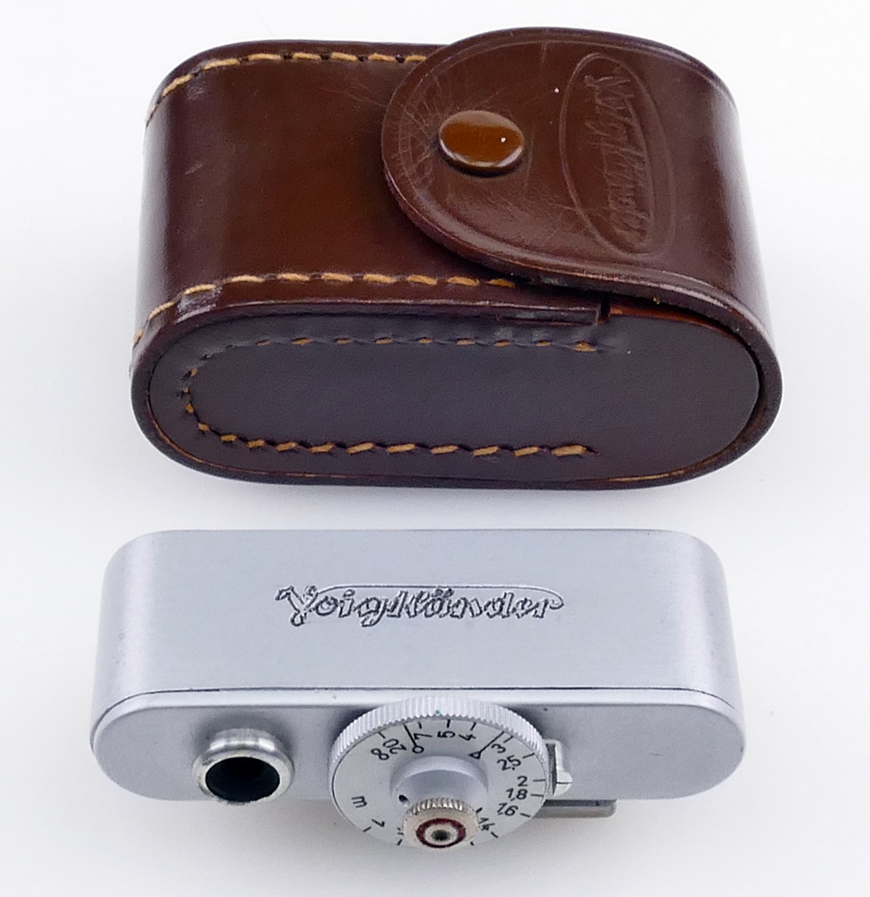 ![]() Voigtländer Voigtländer baute schon 1933 Rollfilmkameras mit Entfernungsmesser. Die späteren Entfernungsmesser unterschieden sich eher nur im Detail. Alle haben einen seitlich verstzten Befestigungsfuß. Obligatorisch, das schöne Ledertäschchen.
