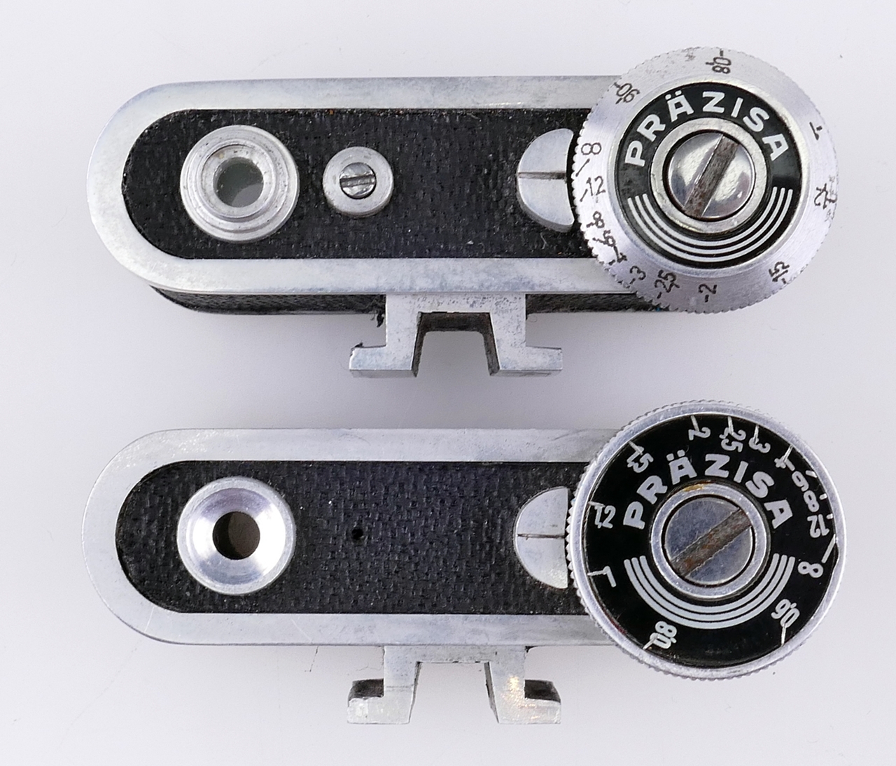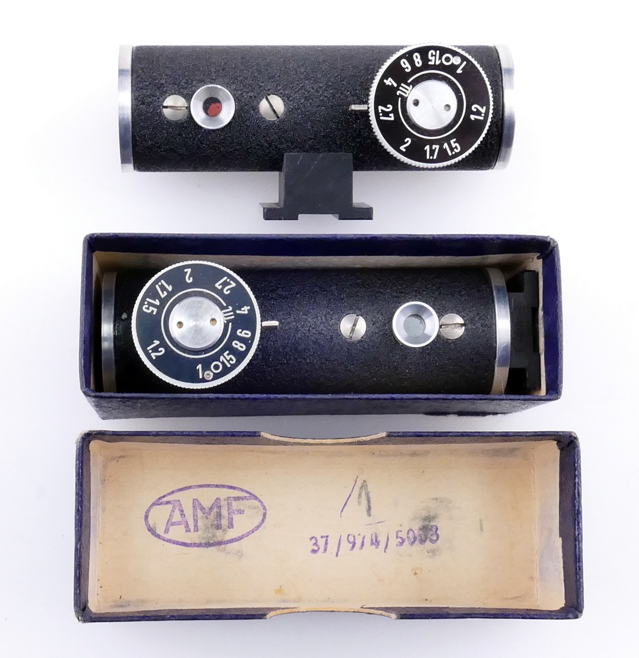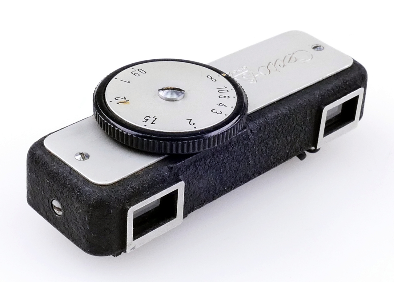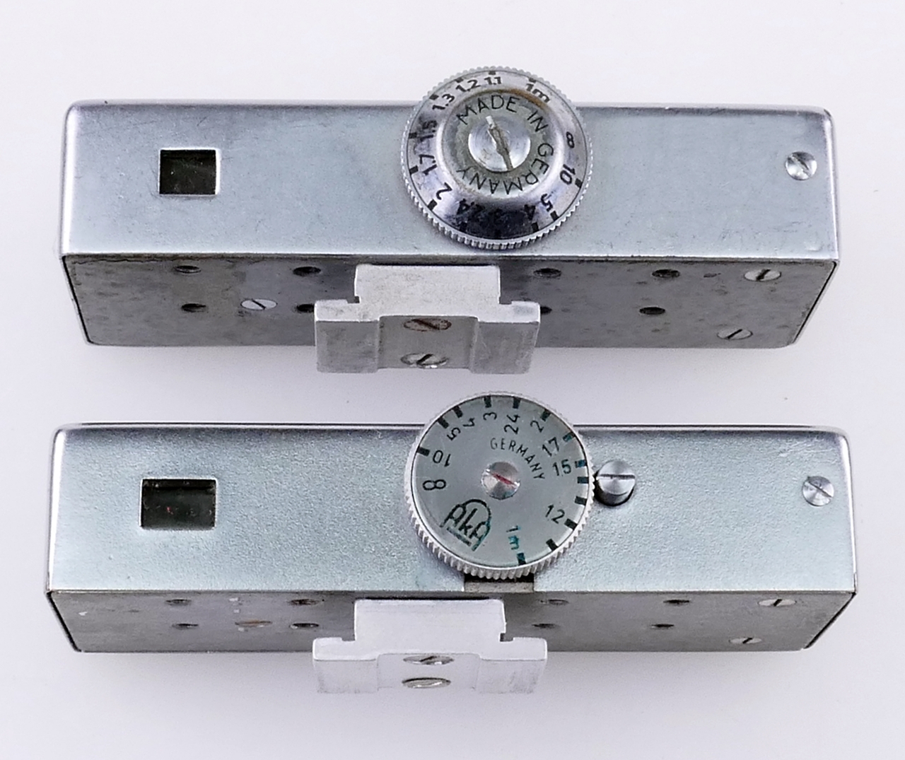 Geringe Unterschiede während der Bauzeit. Das Modell mit gefüllterm Schriftzug stammt aus dem Versuchslabor. Weitere Objekte Der Combimeter IIa von FOGRO Fotogroßhandel vereint einen Entfernungmesser und einen optischen Belichtungsmesser. Hintere Scheibe für Entfernungsmessung, oben die Rechenscheibe für die Belichtung. Kompakter Entfernungsmesser Photometer. Messung ab 70 cm. Zwei Versionen des Päzisa Entfernungsmessers. Hersteller: Präzisa Optik Spangenberg. Certo-S mit feststehender Scheibe und drehbarem Kranz. Aus einer Schmiede: Vergleichbare EM von METRIX und ROWI. Korrekturknopf und versetzbarer Fuß. Sehr präzise Messungen ermöglichen diese EM mit sehr großer Messbasis. Für senkreche Benutzung gebaut. Verschiedene MEDIS EM. Der im rechten Bild unten ist ein Baumuster aus Holz ohne Funktion. AKAMETER - zwei Versionen des großen hochwertigen Entfernungsmessers. Zwei kleine elegante, und ein großer, massiver EM vom Askania Bodenseewerk. Seltene runde Bauform vom AMF - EM für waagerechte und senkrechte Anwendungen. Der FFB COMBIMETER enthält einen Entfernungmesser und optischen Belichtungsmesser. Abnehmbarer Fuß. Seitliche Bedienung am BALDA DISTANZER. Recht selten und massiv ist der Entfernungsmesser Präzi. Der TELEX hat getrennte Sucher für Messung und Anzeige. Unpraktischer Schneider EM für Montage am Objektiv. - - - Haben Sie jetzt den richtigen Durch- bzw. Scharfblick? Vielleicht konnte ich einen kurzen Einblick in die Vielfalt dieser "Kleinigkeiten"geben, oder Lust zu einer Sammlung vermitteln, die nicht viel Platz benötigt. |