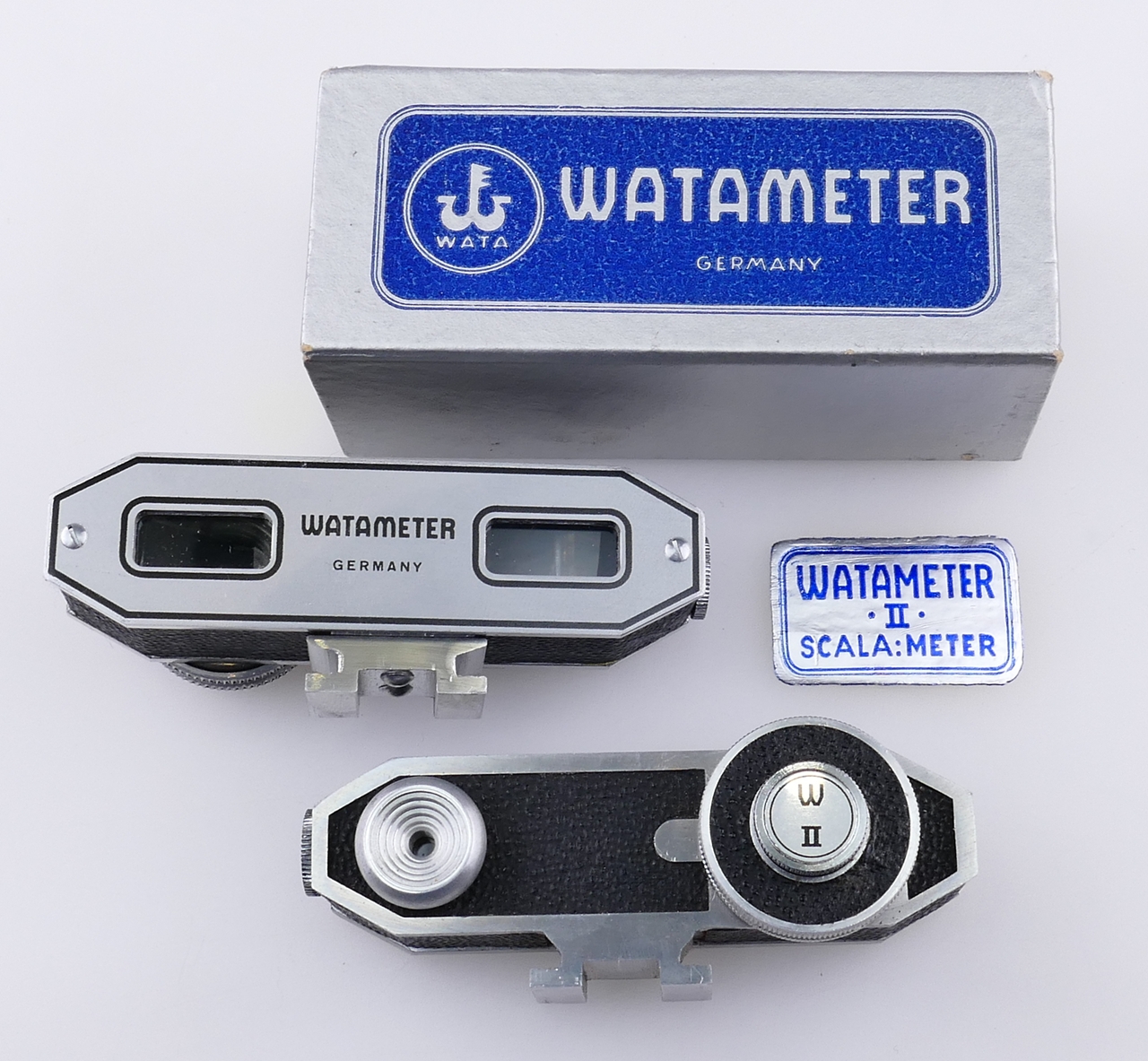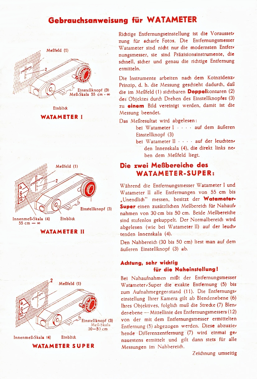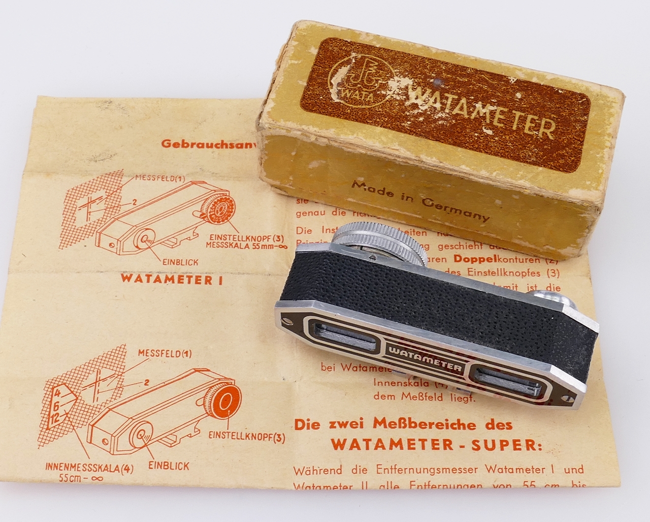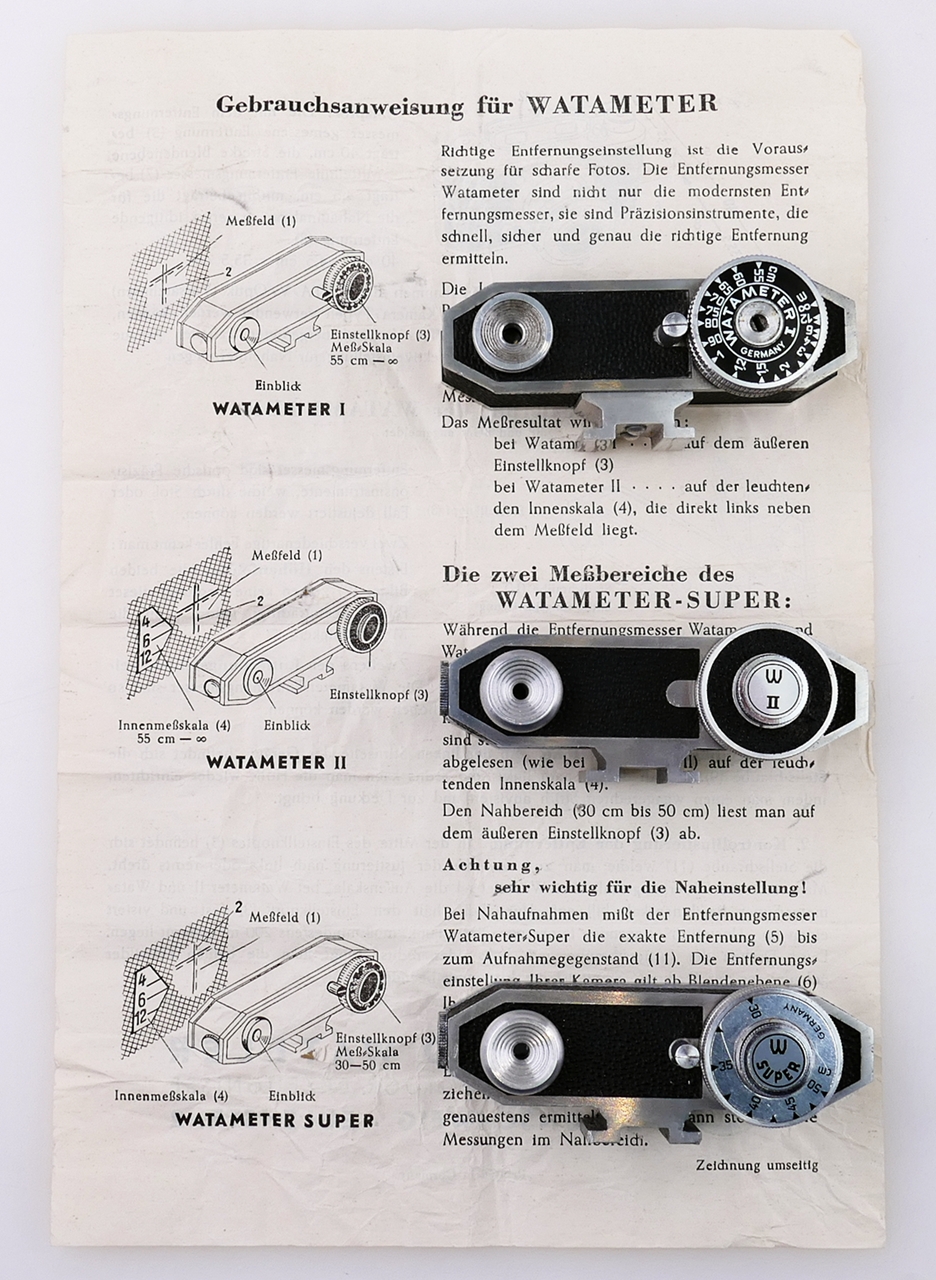 Entfernungsmesser Vorab einige Beispiele von Kameras mit eingebautem Entfernungsmesser. Teilweise haben die Kamerahersteller erheblichen Aufwand betrieben um Entfernungen zu erfassen. Hier am Beispiel von Zeiss Ikon Kameras. In Leica Kameras wurde das System perfektioniert. Zuerst noch mit getrennten Einblick von Sucher und Entfernungsmesser. Später erfolgte die Anzeige von Leuchtrahmen und Entfernung mit großer Basis im Sucherbild. Für mich war es nie ein Problem die richtige Entfernung zu schätzen. Für manche waren Entfernungsmesser aber unentbehliche Helfer. Das funktionierte allerdings nur, wenn diese richtig abgeglichen waren. Erschütterung konnte eine Dejustierung bewirken. Zur Justierung besitzen die meisten Entfernugsmesser eine Korrekturmöglichkeit. Die Bedienung ist einfach, meistens muss in der jeweiligen Entfernung ein Doppelbild in Deckung gebracht werden. Die Entfernung kann Außen am Drehrad oder im Sucher abgelesen werden. Im Laufe der Zeit sammelten sich einige Entfernugsmesser an, meistes als "Beifang" beim Kamerakauf. Dabei lohnt sich durchaus eine nähere Betrachtung dieser "Kleinode". Eine Basis von 85 mm für genaue Messungen haben die großen Entfernungsmesser von Leitz Wetzlar. WATAMETER Einst war meine Heimatstadt Braunschweig ein Zentrum der Fotoindustrie. Dass die bekannten WATAMETER Entfernungsmesser von der Firma Edmund Waterler in Braunschweig hergestellt wurden, erfuhr ich erst später. Es wurden verschiedene Modelle hergestellt. Beim WM I wird die Entfernung an der Einstellschraube abgelesen. Beim WM II und III erfolgt die Ablesung im Sucher. Der WM III hat zusätzlich einen Nahbereich 50 - 30 cm. Selten ist der Watamerter - Flash. Zur Ermittlung der Blendeneinstellung bei gemessener Entfernung. Bedienungsanleitung und zwei frühe Varianten des Watameters.