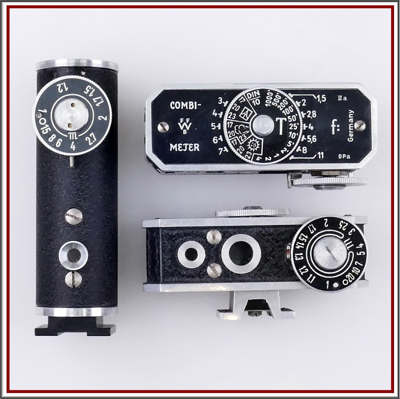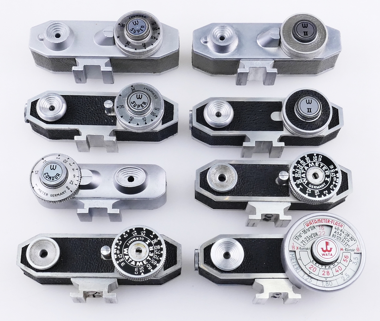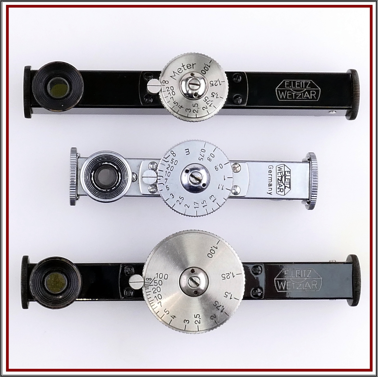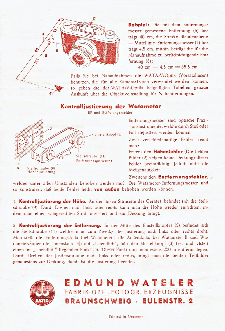 Entfernungsmesser Vorab einige Beispiele von Kameras mit eingebautem Entfernungsmesser. Teilweise haben die Kamerahersteller erheblichen Aufwand betrieben um Entfernungen zu erfassen. Hier am Beispiel von Zeiss Ikon Kameras. In Leica Kameras wurde das System perfektioniert. Zuerst noch mit getrennten Einblick von Sucher und Entfernungsmesser. Später erfolgte die Anzeige von Leuchtrahmen und Entfernung mit großer Basis im Sucherbild. Für mich war es nie ein Problem die richtige Entfernung zu schätzen. Für manche waren Entfernungsmesser aber unentbehliche Helfer. Das funktionierte allerdings nur, wenn diese richtig abgeglichen waren. Erschütterung konnte eine Dejustierung bewirken. Zur Justierung besitzen die meisten Entfernugsmesser eine Korrekturmöglichkeit. Die Bedienung ist einfach, meistens muss in der jeweiligen Entfernung ein Doppelbild in Deckung gebracht werden. Die Entfernung kann Außen am Drehrad oder im Sucher abgelesen werden. Im Laufe der Zeit sammelten sich einige Entfernugsmesser an, meistes als "Beifang" beim Kamerakauf. Dabei lohnt sich durchaus eine nähere Betrachtung dieser "Kleinode". Eine Basis von 85 mm für genaue Messungen haben die großen Entfernungsmesser von Leitz Wetzlar. WATAMETER Einst war meine Heimatstadt Braunschweig ein Zentrum der Fotoindustrie. Dass die bekannten WATAMETER Entfernungsmesser von der Firma Edmund Waterler in Braunschweig hergestellt wurden, erfuhr ich erst später. Es wurden verschiedene Modelle hergestellt. Beim WM I wird die Entfernung an der Einstellschraube abgelesen. Beim WM II und III erfolgt die Ablesung im Sucher. Der WM III hat zusätzlich einen Nahbereich 50 - 30 cm. Selten ist der Watamerter - Flash. Zur Ermittlung der Blendeneinstellung bei gemessener Entfernung. Bedienungsanleitung und zwei frühe Varianten des Watameters.