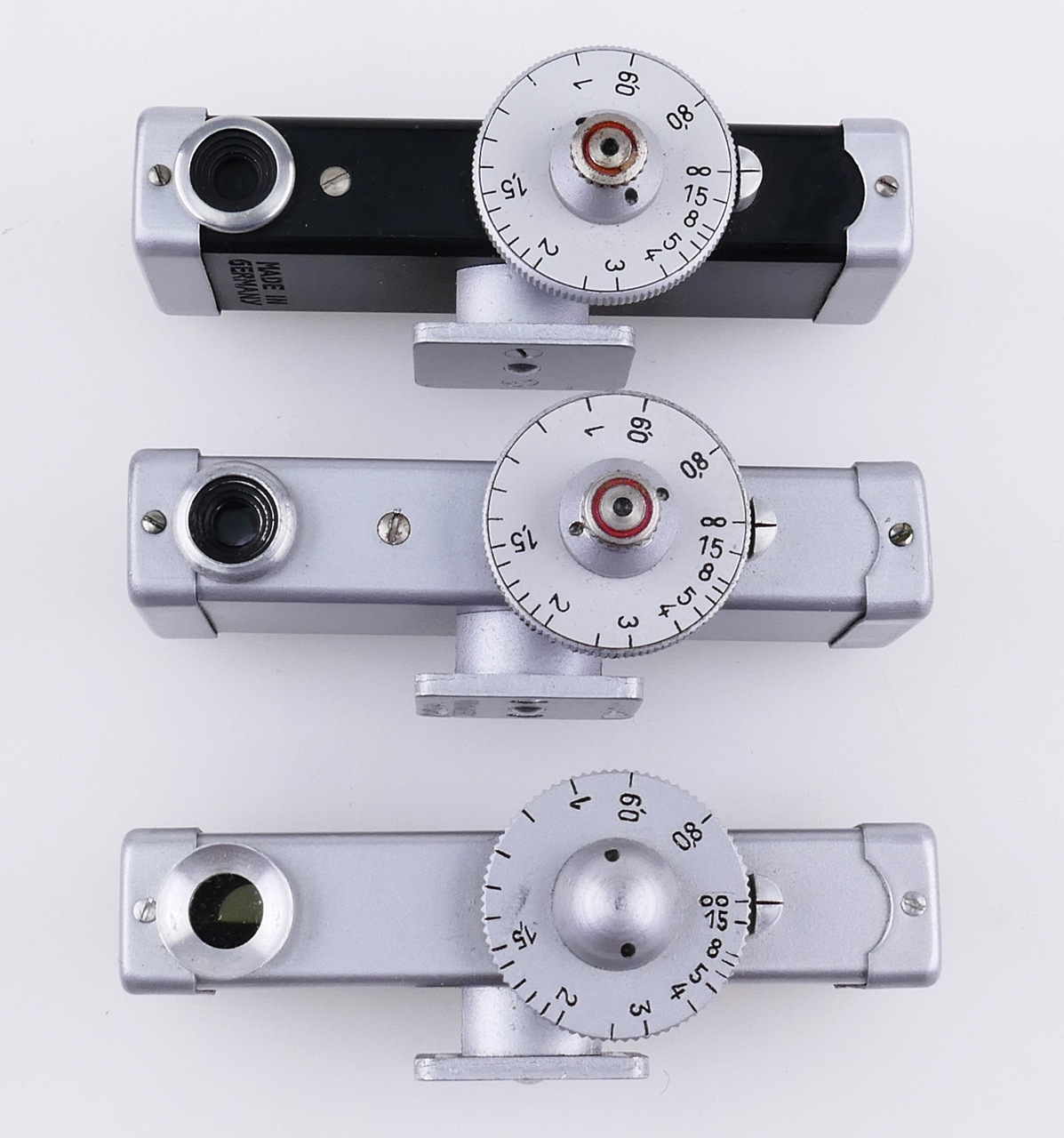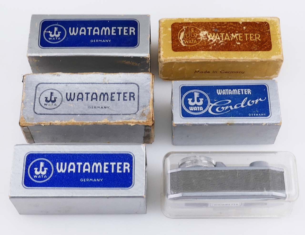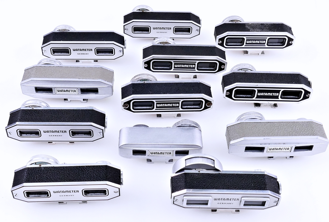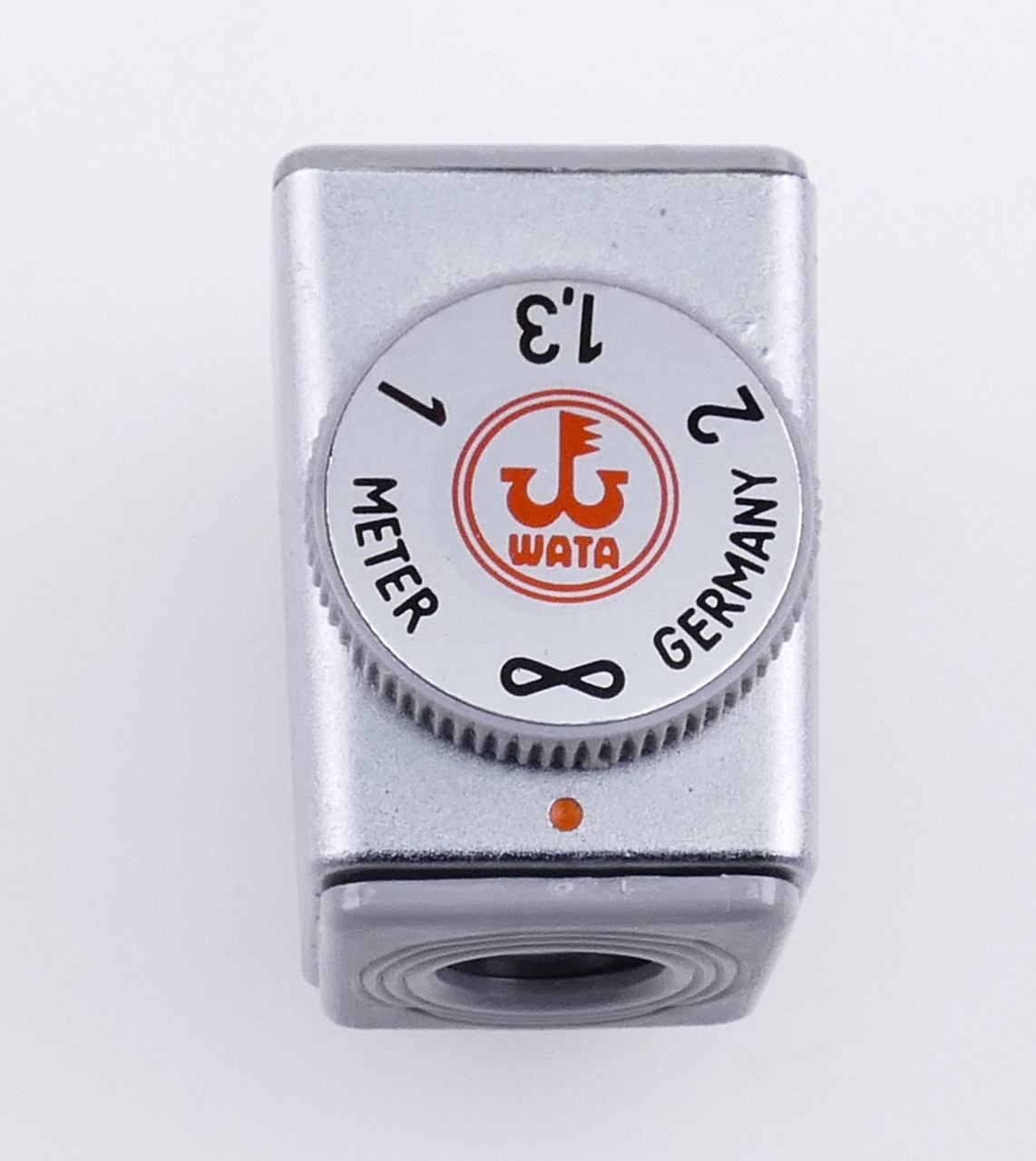 Entfernungsmesser Vorab einige Beispiele von Kameras mit eingebautem Entfernungsmesser. Teilweise haben die Kamerahersteller erheblichen Aufwand betrieben um Entfernungen zu erfassen. Hier am Beispiel von Zeiss Ikon Kameras. In Leica Kameras wurde das System perfektioniert. Zuerst noch mit getrennten Einblick von Sucher und Entfernungsmesser. Später erfolgte die Anzeige von Leuchtrahmen und Entfernung mit großer Basis im Sucherbild. Für mich war es nie ein Problem die richtige Entfernung zu schätzen. Für manche waren Entfernungsmesser aber unentbehliche Helfer. Das funktionierte allerdings nur, wenn diese richtig abgeglichen waren. Erschütterung konnte eine Dejustierung bewirken. Zur Justierung besitzen die meisten Entfernugsmesser eine Korrekturmöglichkeit. Die Bedienung ist einfach, meistens muss in der jeweiligen Entfernung ein Doppelbild in Deckung gebracht werden. Die Entfernung kann Außen am Drehrad oder im Sucher abgelesen werden. Im Laufe der Zeit sammelten sich einige Entfernugsmesser an, meistes als "Beifang" beim Kamerakauf. Dabei lohnt sich durchaus eine nähere Betrachtung dieser "Kleinode". Eine Basis von 85 mm für genaue Messungen haben die großen Entfernungsmesser von Leitz Wetzlar. WATAMETER Einst war meine Heimatstadt Braunschweig ein Zentrum der Fotoindustrie. Dass die bekannten WATAMETER Entfernungsmesser von der Firma Edmund Waterler in Braunschweig hergestellt wurden, erfuhr ich erst später. Es wurden verschiedene Modelle hergestellt. Beim WM I wird die Entfernung an der Einstellschraube abgelesen. Beim WM II und III erfolgt die Ablesung im Sucher. Der WM III hat zusätzlich einen Nahbereich 50 - 30 cm. Selten ist der Watamerter - Flash. Zur Ermittlung der Blendeneinstellung bei gemessener Entfernung. Bedienungsanleitung und zwei frühe Varianten des Watameters.