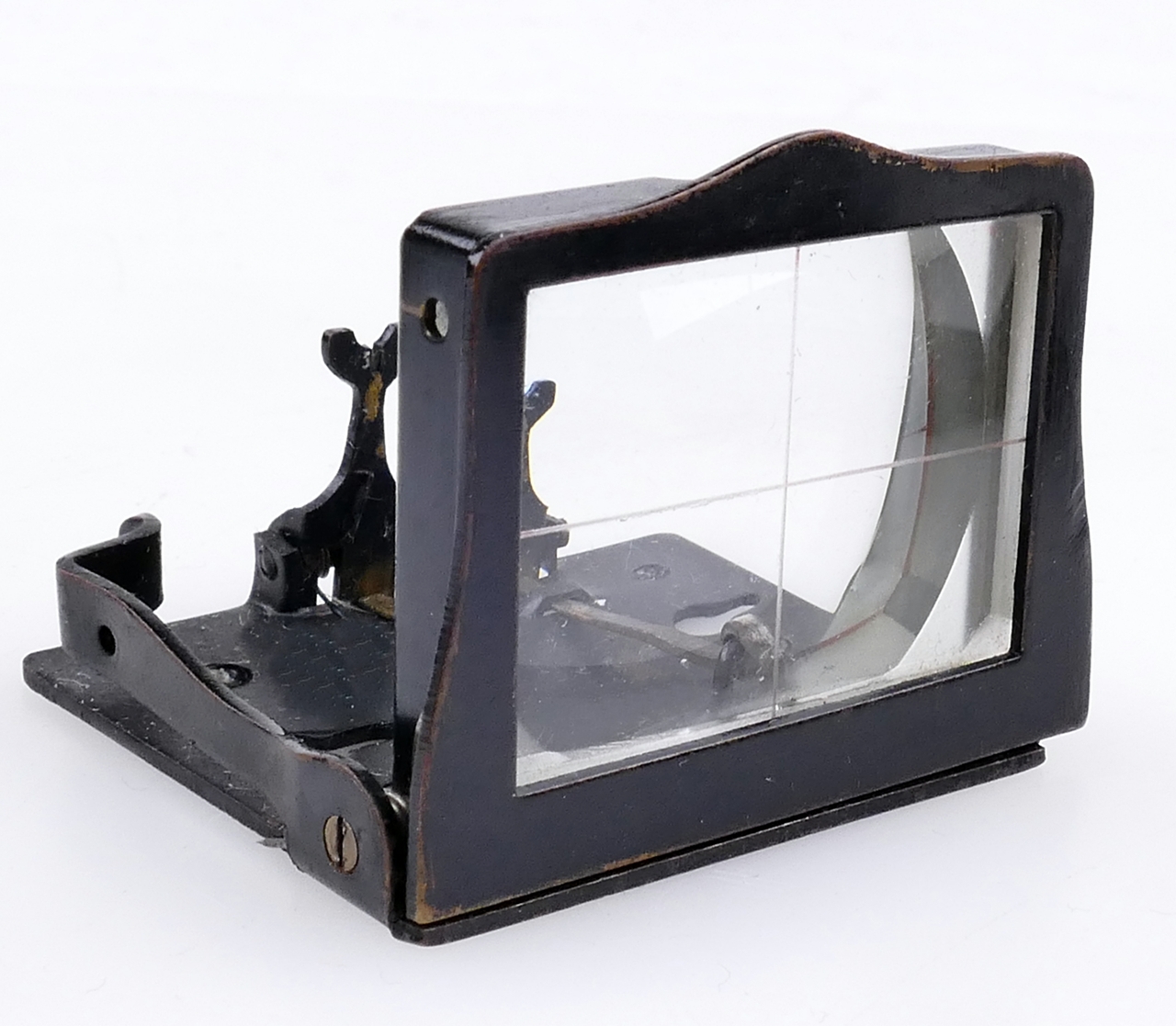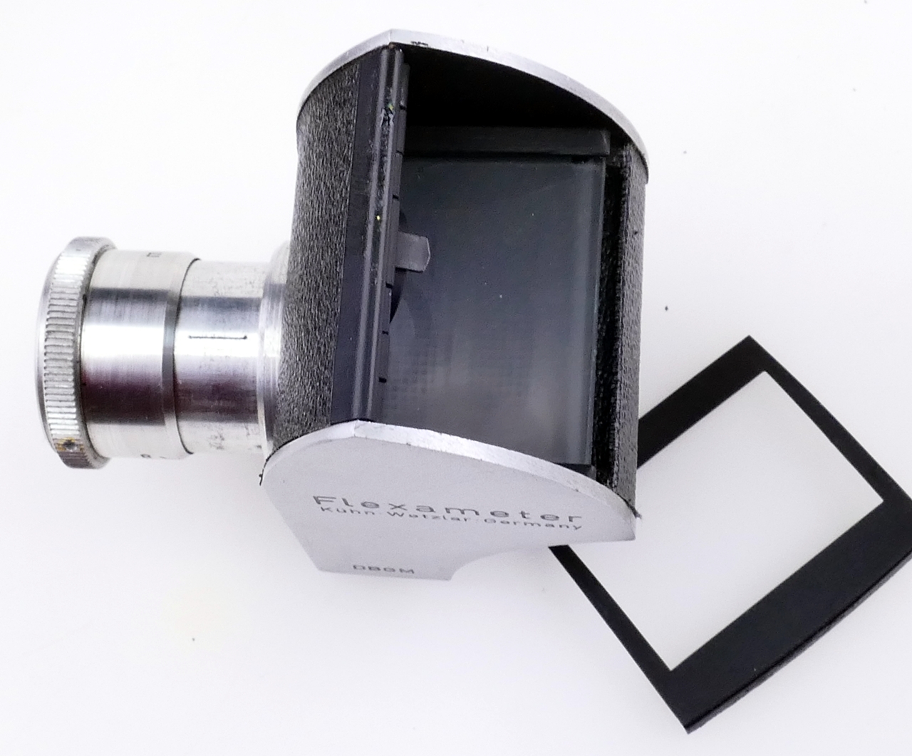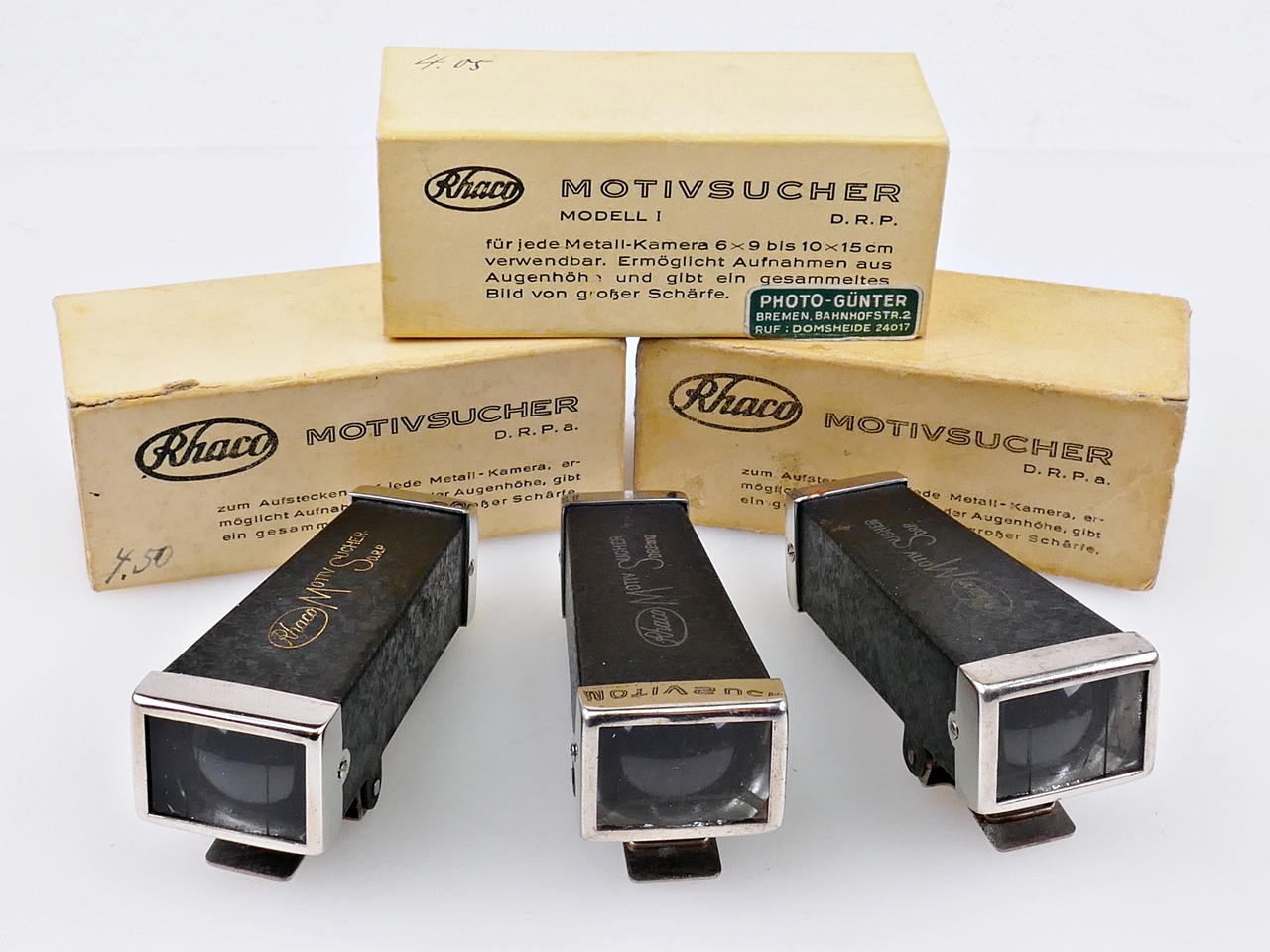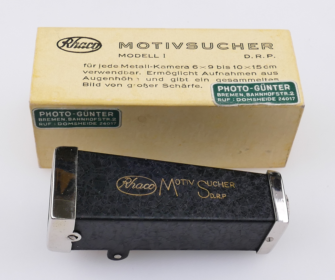 Was es noch gab. Brillantsucher, wegen der leichten Verschmutzung ist der Kleine geschlossen und der Große kann geöffnet werden. Große optische Klappsucher gab es schon früh als Zubehör für Plattenkameras zu kaufen. Seltenes Prinzip: Flexameter, Reflex - Sucher mit Mattscheibe von Kühn Wetzlar. Das Sucherbild wird seitenrichtig auf der Mattscheibe betrachtet. Scharfstellung am Objektiv. Mit Maske für KB-Format und schwenkbarer Lupe. Der Motivsucher von Rhaco wird freihand benutzt, lässt sich aber auch an Plattenkameras befestigen. Er wurde mit verschiedenen Größen und Markierungen im Frontglas angeboten. |