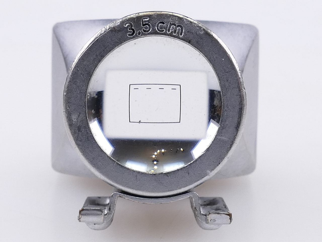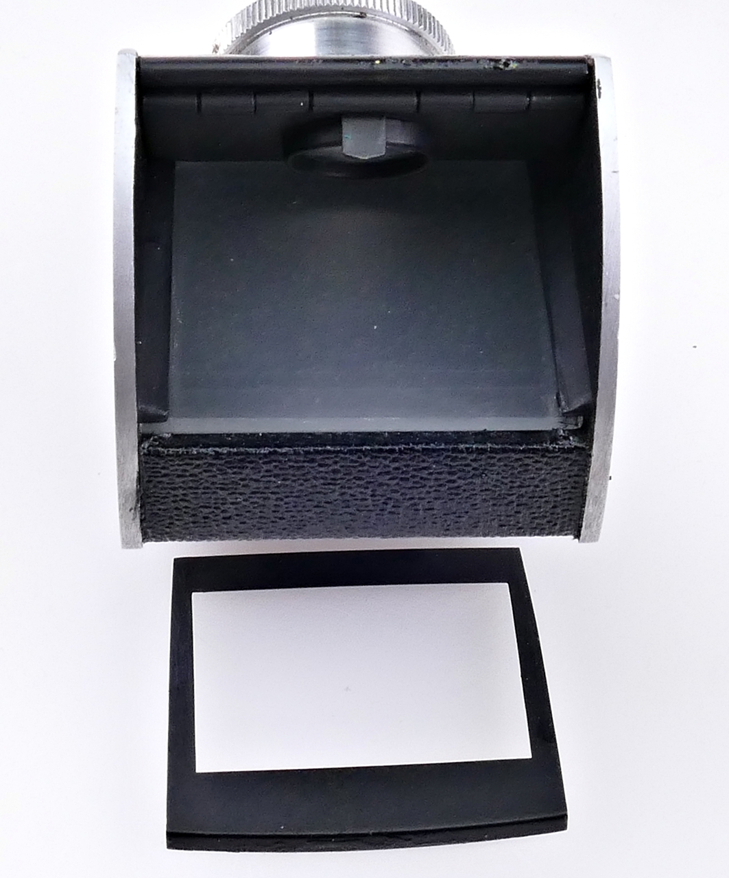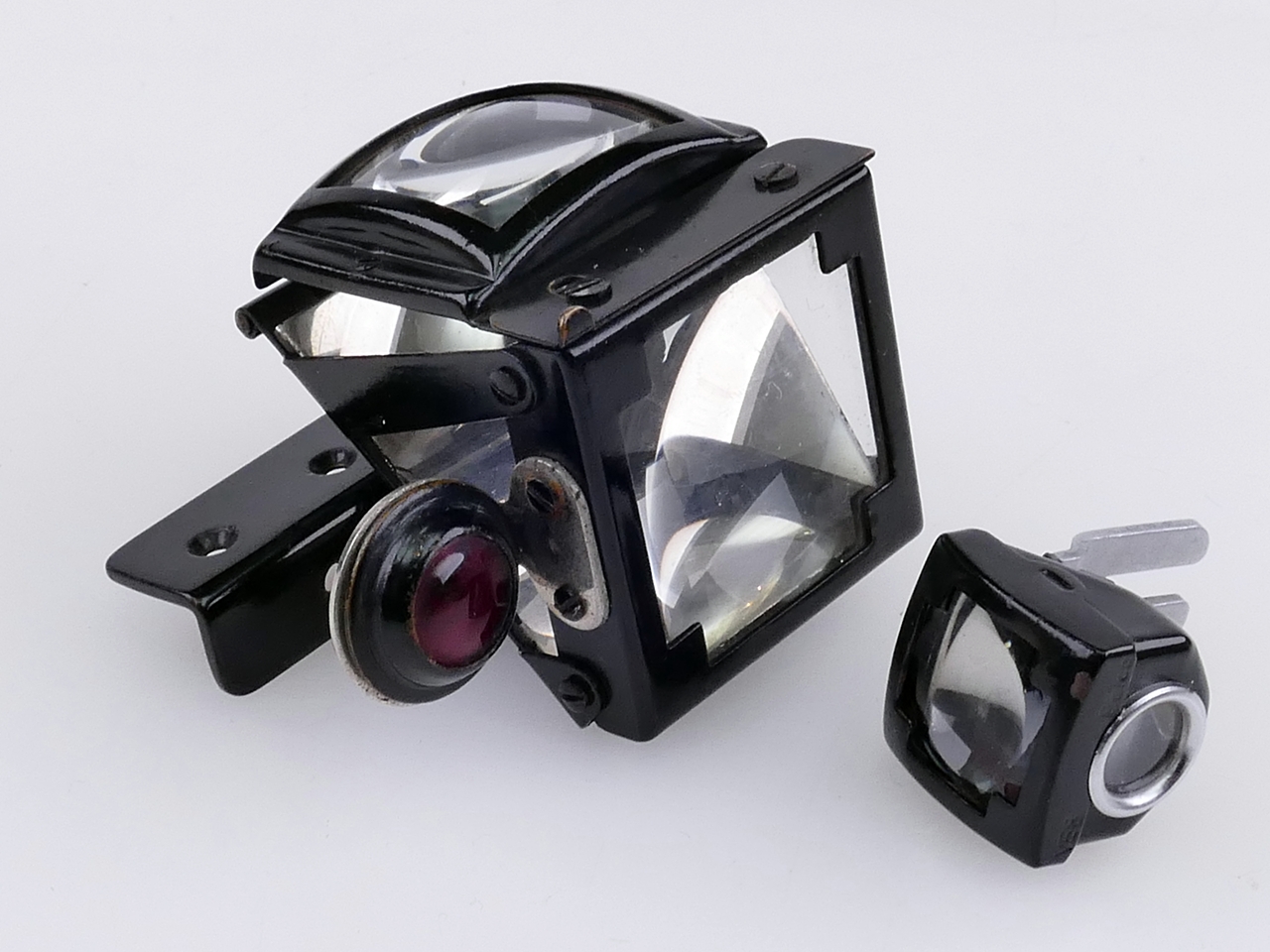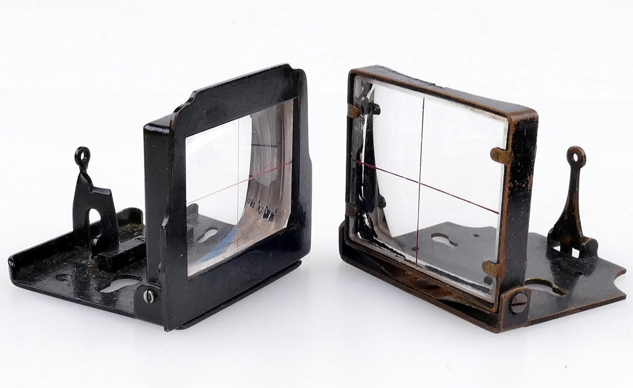 Was es noch gab. Brillantsucher, wegen der leichten Verschmutzung ist der Kleine geschlossen und der Große kann geöffnet werden. Große optische Klappsucher gab es schon früh als Zubehör für Plattenkameras zu kaufen. Seltenes Prinzip: Flexameter, Reflex - Sucher mit Mattscheibe von Kühn Wetzlar. Das Sucherbild wird seitenrichtig auf der Mattscheibe betrachtet. Scharfstellung am Objektiv. Mit Maske für KB-Format und schwenkbarer Lupe. Der Motivsucher von Rhaco wird freihand benutzt, lässt sich aber auch an Plattenkameras befestigen. Er wurde mit verschiedenen Größen und Markierungen im Frontglas angeboten. |