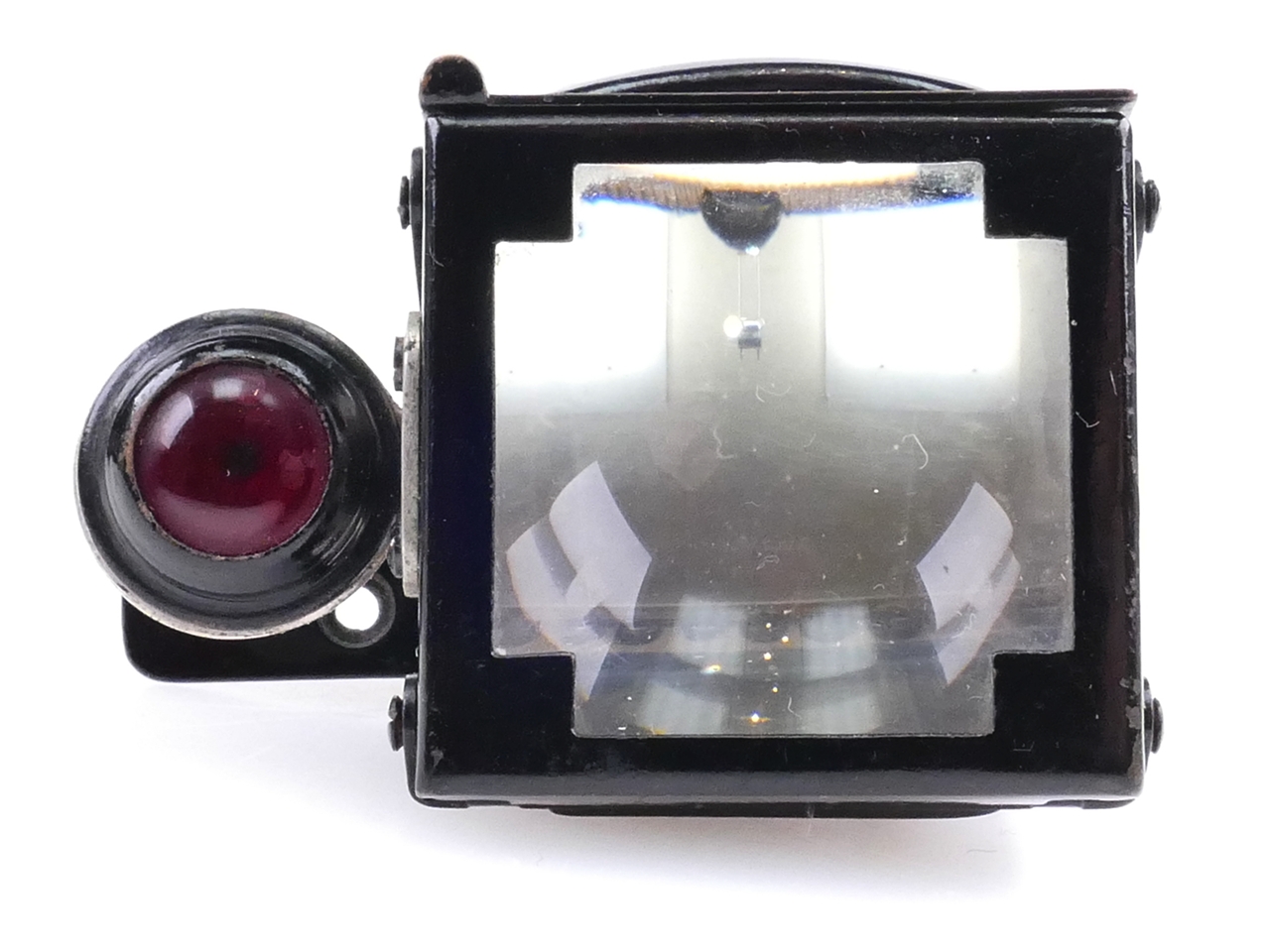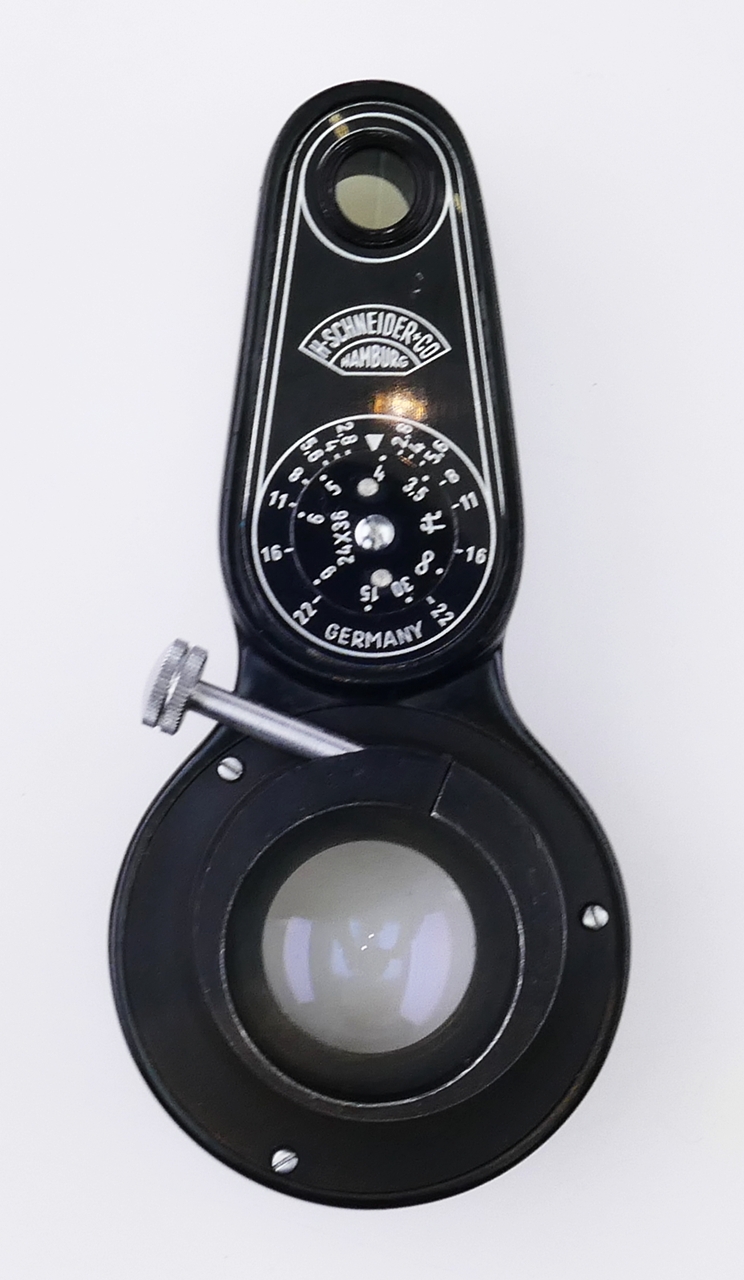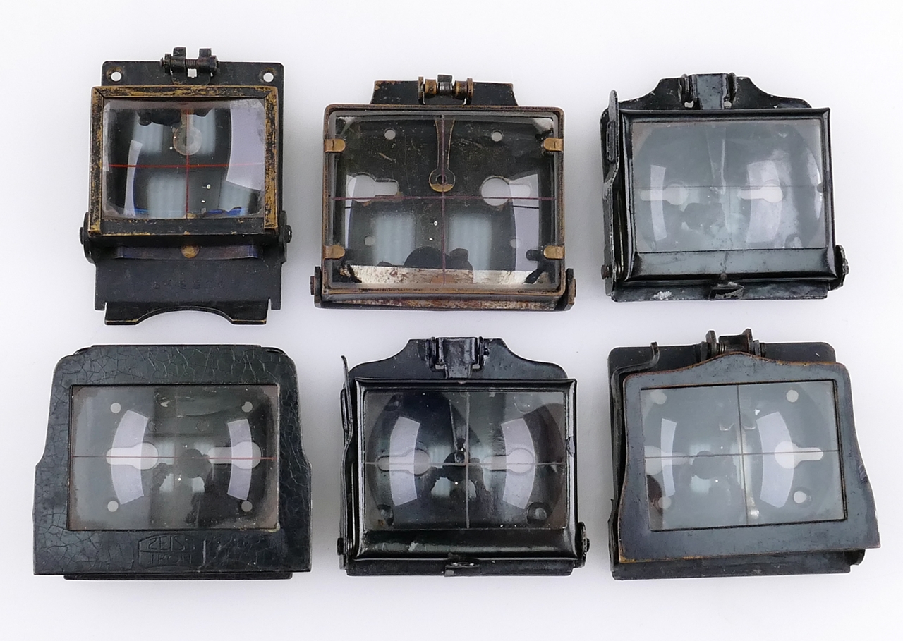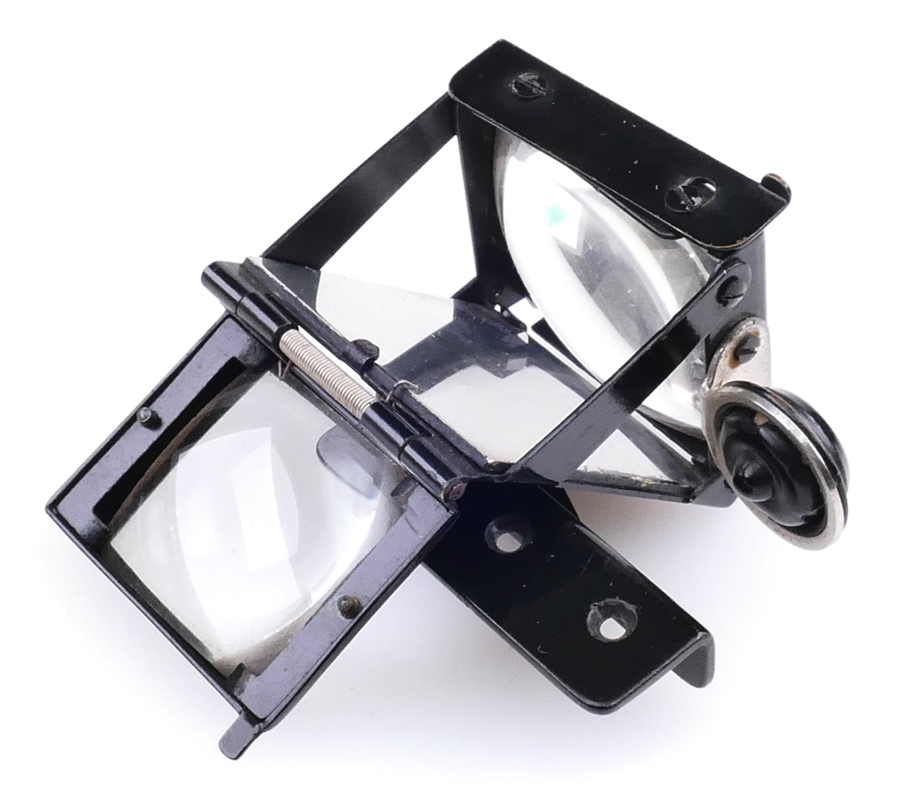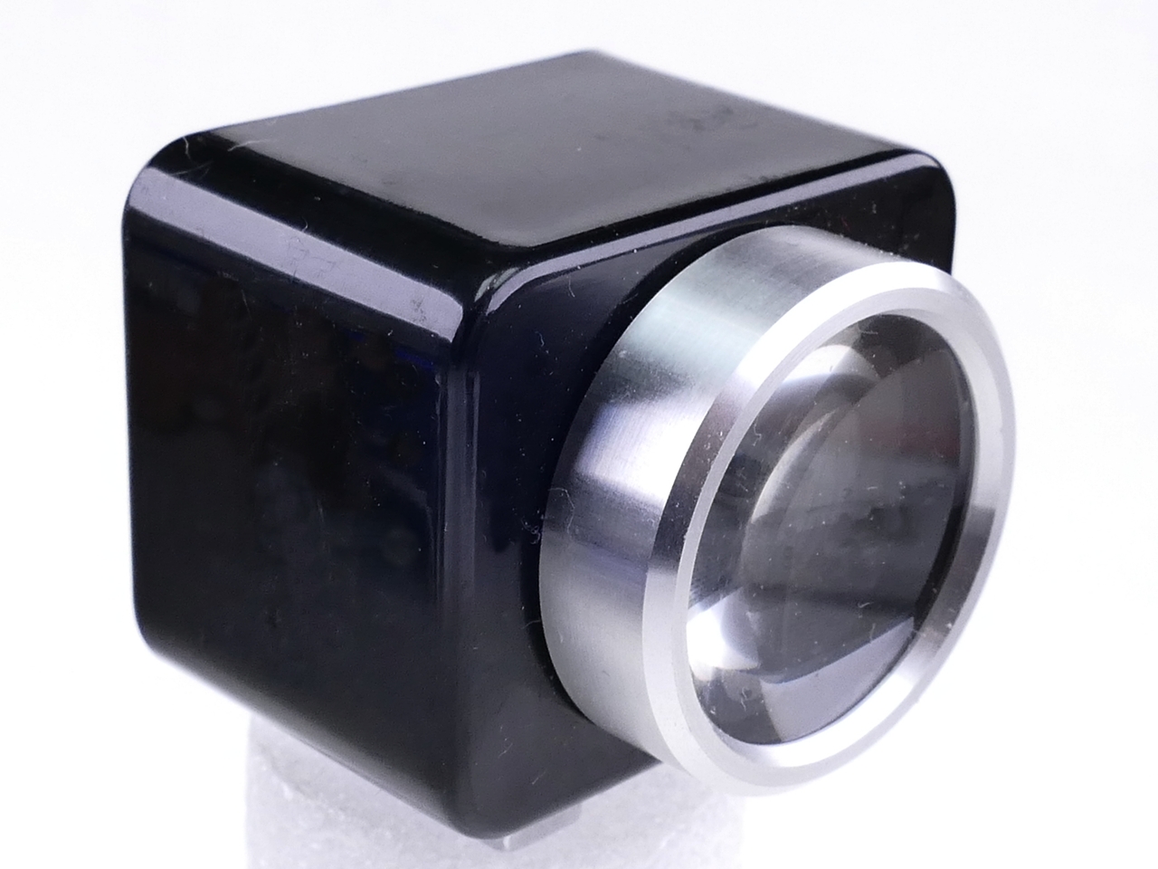 Was es noch gab. Brillantsucher, wegen der leichten Verschmutzung ist der Kleine geschlossen und der Große kann geöffnet werden. Große optische Klappsucher gab es schon früh als Zubehör für Plattenkameras zu kaufen. Seltenes Prinzip: Flexameter, Reflex - Sucher mit Mattscheibe von Kühn Wetzlar. Das Sucherbild wird seitenrichtig auf der Mattscheibe betrachtet. Scharfstellung am Objektiv. Mit Maske für KB-Format und schwenkbarer Lupe. Der Motivsucher von Rhaco wird freihand benutzt, lässt sich aber auch an Plattenkameras befestigen. Er wurde mit verschiedenen Größen und Markierungen im Frontglas angeboten. |