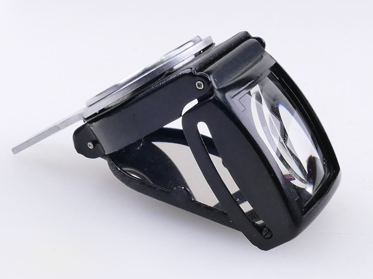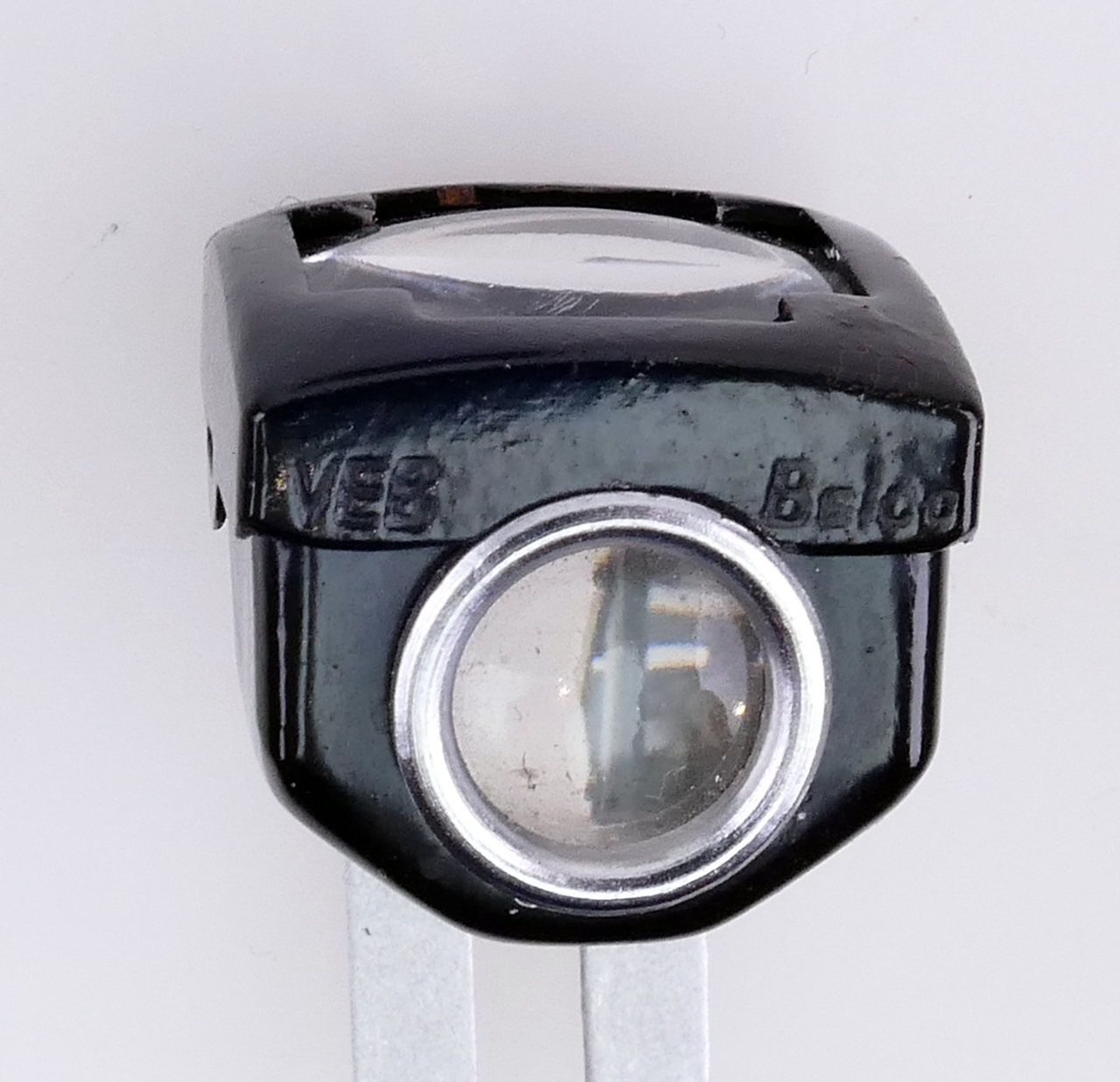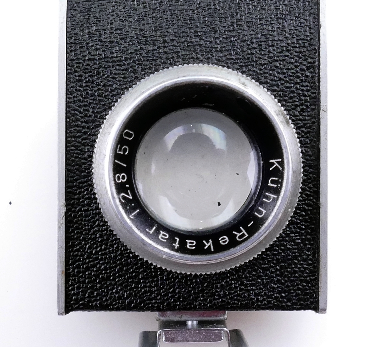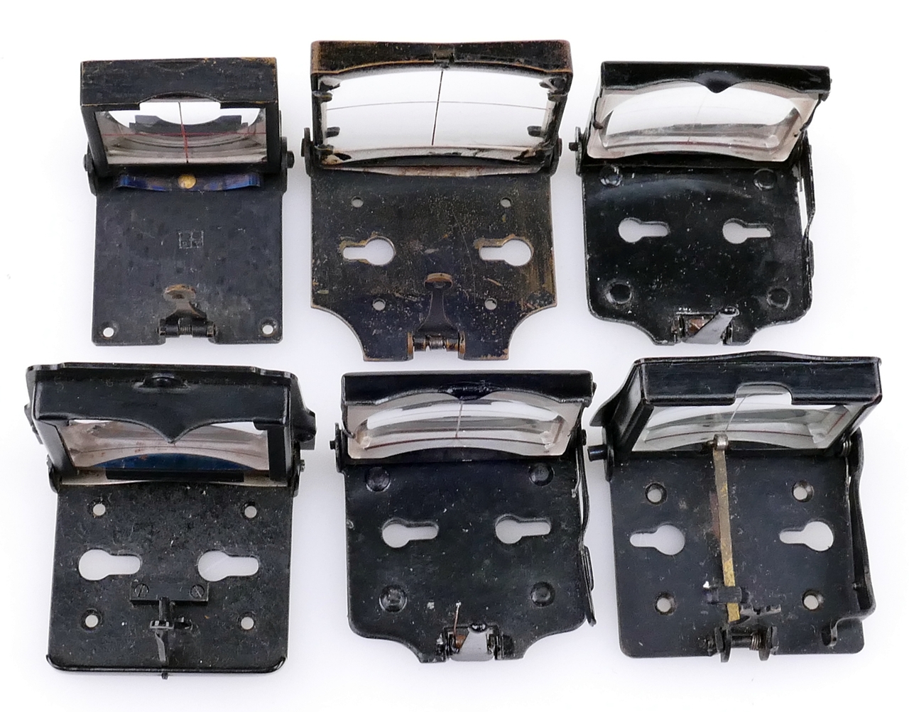 Was es noch gab. Brillantsucher, wegen der leichten Verschmutzung ist der Kleine geschlossen und der Große kann geöffnet werden. Große optische Klappsucher gab es schon früh als Zubehör für Plattenkameras zu kaufen. Seltenes Prinzip: Flexameter, Reflex - Sucher mit Mattscheibe von Kühn Wetzlar. Das Sucherbild wird seitenrichtig auf der Mattscheibe betrachtet. Scharfstellung am Objektiv. Mit Maske für KB-Format und schwenkbarer Lupe. Der Motivsucher von Rhaco wird freihand benutzt, lässt sich aber auch an Plattenkameras befestigen. Er wurde mit verschiedenen Größen und Markierungen im Frontglas angeboten. |