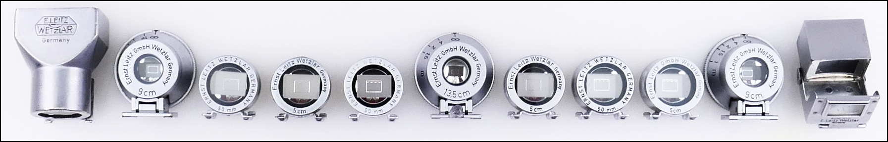 Sucher Leica Zweifellos die bei Sammlern begehrtesten Sucher sind die von Leica. Einige haben sich auch bei mir angesammelt. Manche behaupten, Leica wäre eine Firma die Fotozubehör baut und nebenher auch noch Kameras herstellt. Tatsächlich gibt es unzählige Adapter, Zwischenringe, Filter, Sucher, Zubehör für Makro- und Mikrofotografie, usw. Die kleinen Spiegelsucher tragen den Codenamen SBOOI. Zuerst mit 5 cm, später mit 50 mm beschriftet. Spiegelsucher SHOOC für 9 cm und 13,5 cm Objektive. Entfernugsskalen in Meter und Feed. Den Codenamen SBLOO hat der Sucher für Objektive mit 35mm Brennweite. Für 28 mm Brennweite gab es den Klappsucher SUOOQ. Heute ein begehtes Sammelobjekt. Universalsucher VIOOH für Brennweiten von 35 mm bis 135 mm. Mit Entfernungseinstellung am Fuß. VIDOM Universalsucher für 3,5 cm bis 13,5 cm. Seitenverkehrtes Bild, das um 180° geschwenkt werden kann. "Torpedosucher" VIFUR. Die Brennweite wird am Suchereinblick eingestellt und im Sucher angezeigt. Der Winkelsucher AUFSU ermöglicht eine Betrachtung von Oben und von der Seite für unbemerkte Aufnahmen. Winkelsucher WINTU - verschiedene Ausführungen. Seitlicher Einblick des Suchers und des Entfernungsmessers. Voigtländer Aufstecksucher - Sucherlupen für Brillantsucher gab es in verschiedenen Größen und Ausführungen. Die einzigartigen Kontursucher werden mal genauer betrachtet. Nicht jeder kam mit dem Gebrauch dieser Sucher zurecht, die auch als Motivsucher Verwendung fanden.