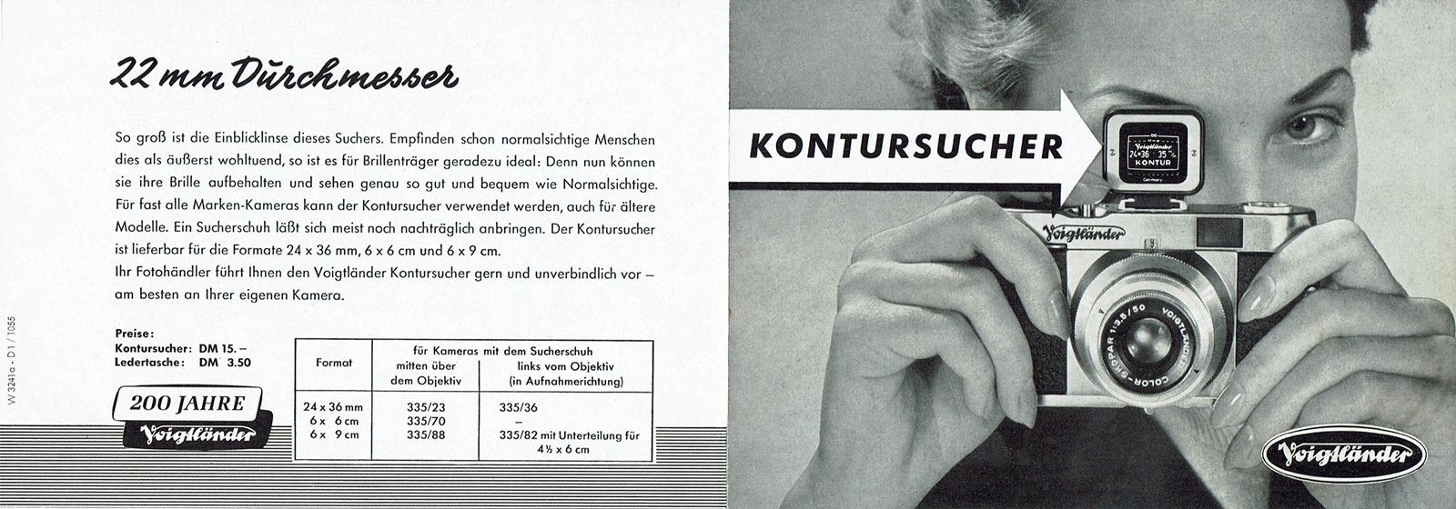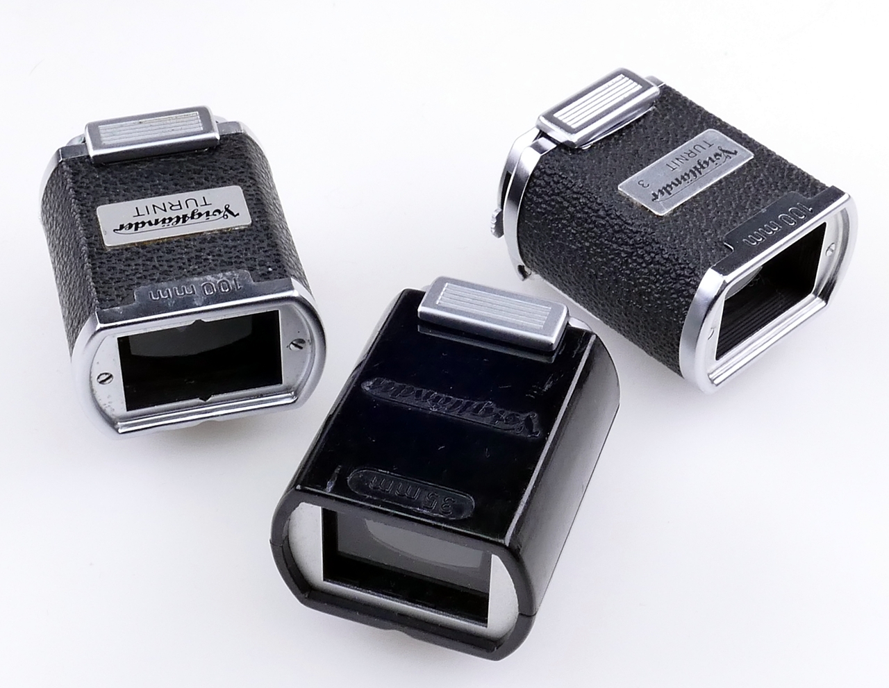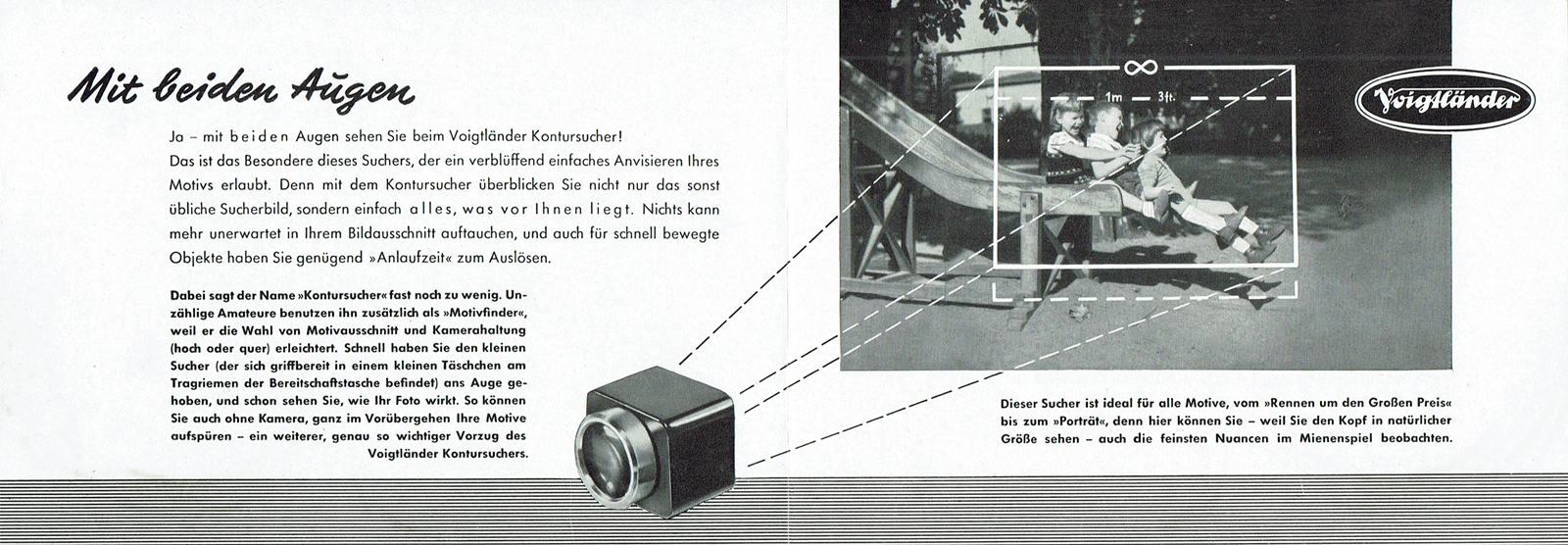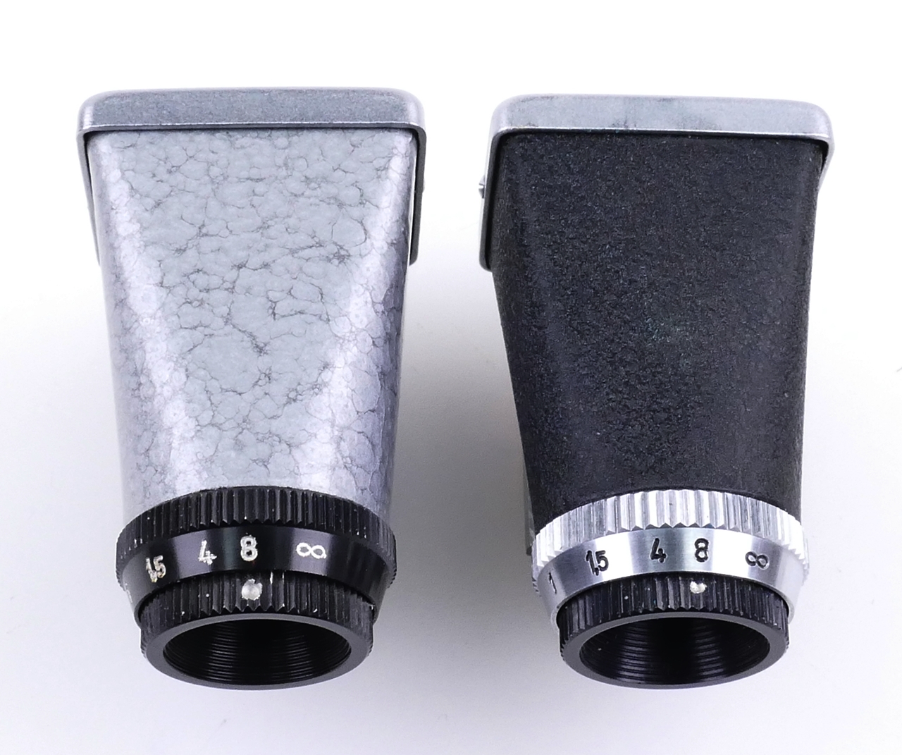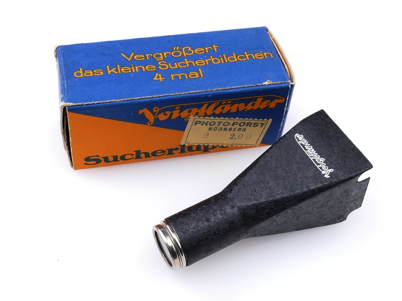 Optische Sucher, fast immer zum Aufstecken auf den Zubehörschuh der Sucherkamera wurden benötigt, wenn eine andere Brennweite verwendet wurde, bei Parallaxenausgleich im Nahbereich, für bessere Sicht z.B. für Brillenträger, oder die Kameras keinen eingebauten Sucher hatten. Hergestellt wurden die Sucher von Kamera - Firmen, es gab aber auch fremde Anbieter, die universelle Geräte bauten. |