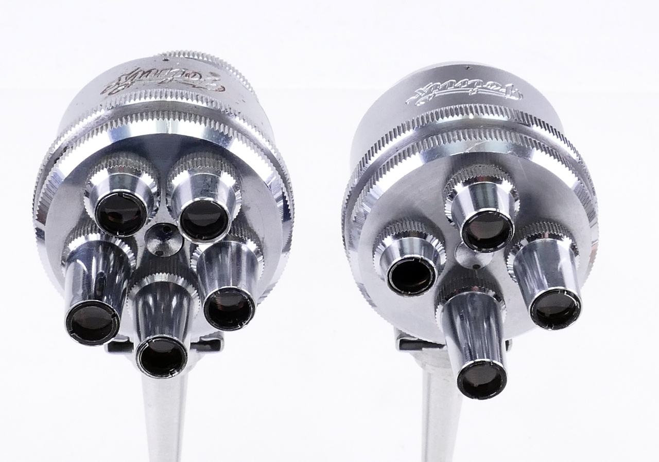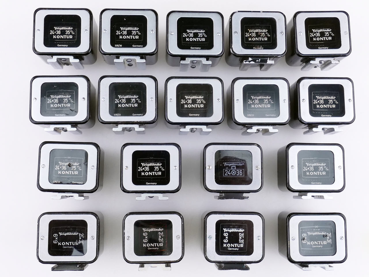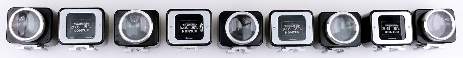 ![]() Verschiedene Ausführungen für 24x36mm, 6x6cm, 6x9cm. Genieteten oder gegossenen Fuß. Sondermodell rotes Glas. 3 Turnit Sucher für 35mm und 100mm. Das 1. Modell war aus Kunststoff. Turnit 3 hat noch eine Maske für 50mm. Ein Modell mit Schiebemaske und der schöne kleine Sucher haben es leider nicht zur Serienreife geschafft. Winkelsucher - wird bei Voigtländer Winkelfernrohr genannt. Schwenkbar, für mehrere Kameramodelle. Kodak Kodak Sucher mit seitlich versetztem Fuß für die Retina Kameras. Drei Modelle vom Sportsucher. Winkelsucher und Dualsucher, umschaltbar auf 35mm und 80mm für Retina Kameras. Zeiss Zeiss Ikon Leuchtrahmen - Sucher 624. Rahmenlinien für 30mm, 45mm und 75mm Objektive. Brillantsucher Winkelfernrohre für Contarex und Contaflex. Aufstecksucher Movigonar und Movitelar für Filmkameras. Universal-Revolversucher 440 für Contax mit 5 Brennweiten von 25mm bis 135mm. Zusatz- Klappsucher 437/2 für Kameras Ikonta und Nettar. Sucher um 90° schwenkbar für Querformat. Diverse Sucher Einfache Sucher sind für eine Brennweite bestimmt. Durch Anbringen einer Maske können die Sucher für eine oder zwei weitere Brennweiten benutzt werden. Aufwändigere Modelle decken bis zu 6 verschiedene Brennweiten ab. Altissa Aufstecksucher für Altix - Kameras Universell verwendbarer Sucher, für 35mm, mit Masken für 50mm und 90mm Brennweite. Einfacher Leuchtrahmensucher Tele - Weitwinkel aus Japan. Kunststoff - Sucher 135mm von Steinheil München. Russische Aufstecksucher 35mm und 90mm und Fernrohr - Sucher 100mm von Canon. Robot Aufstecksucher und 6x6cm Sucher von WATA Braunschweig Zwei Sucher von Braun. Hier wird nur eine Maske verändert. Der TEWE hat einen echten Zoom von 35 - 200mm. Großer Fernrohrsucher für KB - Format von MEOPTA. Nahbereich bis 33cm. Sucher mit drei Optiken für 35mm, 90mm und 135mm von Steinheil München. Foinix Universalsucher für 4 oder 5 Brennweiten. Selten die Okular-Verstellung von +- 2 Dioptrien. Russische Kopie des Universalsuchers von Carl Zeiss Jena. 35 - 50 -100 mm und feet - Skala besitzt der argus Universalsucher aus Liechtenstein. Linhof Die Königsklasse - Linhof Universalsucher für das Format 9 x 12 cm