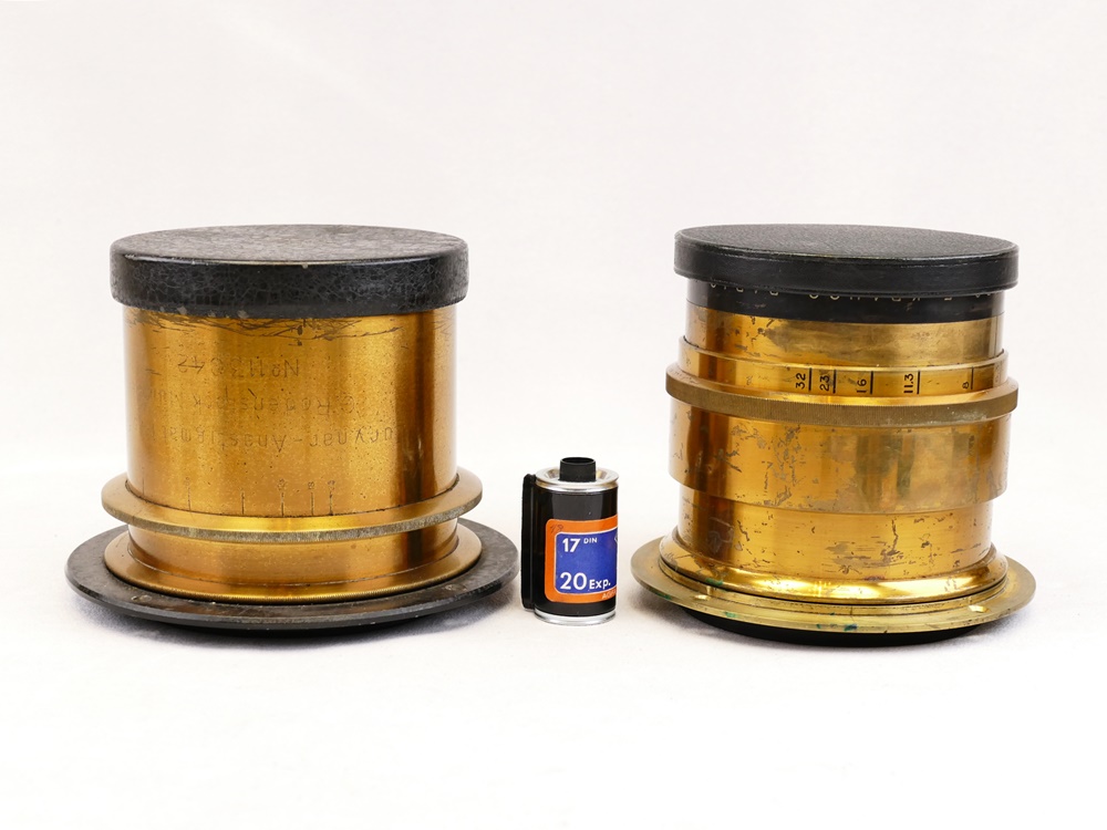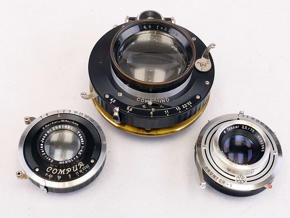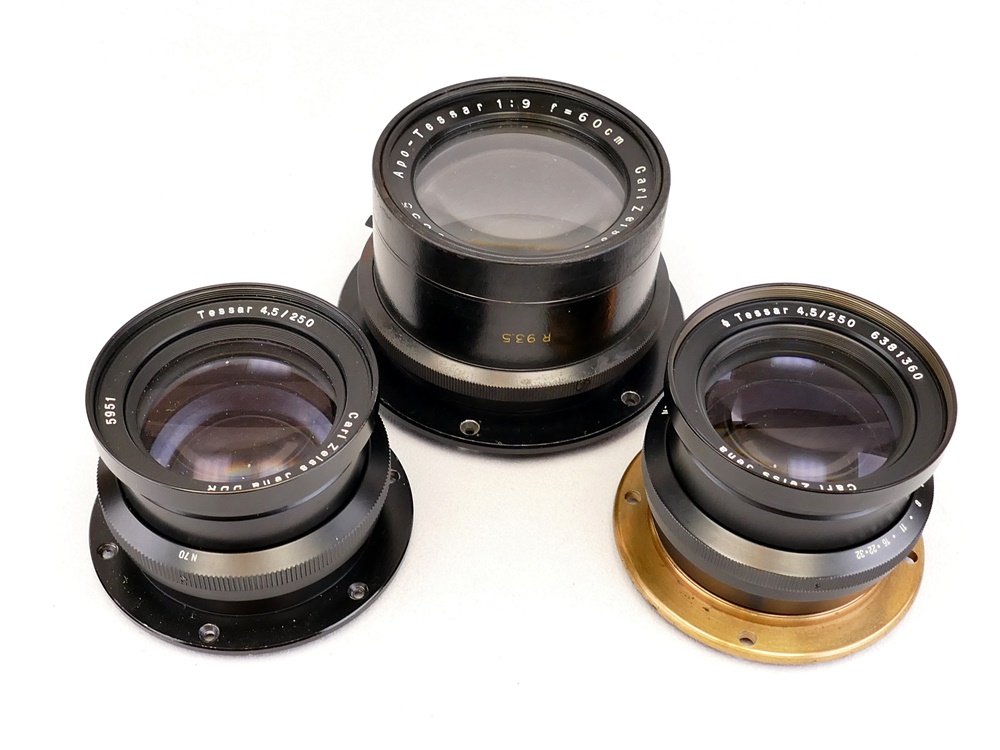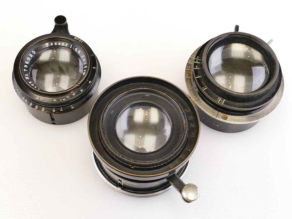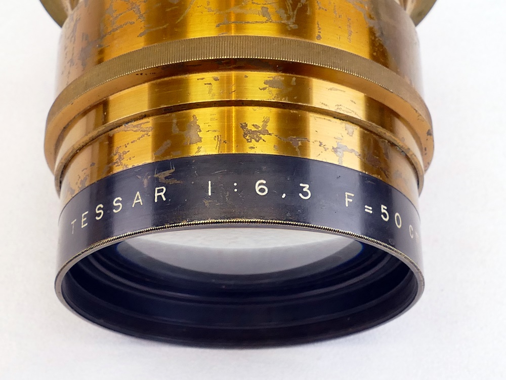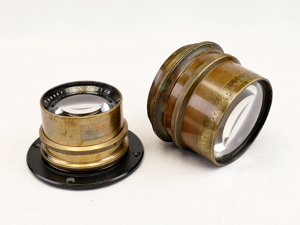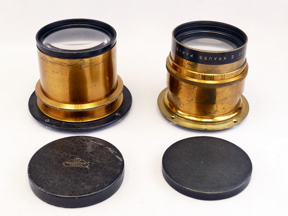 Während frühzeitlich oft lichtschwache Aplanat-Konstruktionen Verwendung fanden, kam mit Einführung der Tessare (4-Linser) von Carl Zeiss und der Heliare (5-Linser) von Voigtländer mit einer Lichtstärke von 1:4,5 eine neue Objektivgeneration zur Anwendung. Die Bauart der "Neuen" war kürzer, aber nicht leichter, weil große Glaslinsen verbaut wurden. G. Rodenstock München Eurynar - Anastigmat No. 113042 1:4,5 f = 36 cm Gewicht: 1,8 kg E. Krauss Paris Tessar No. 111269 1:6,3 f = 50 cm Gewicht: 2,7 kg
