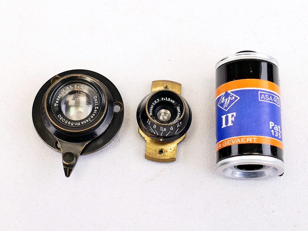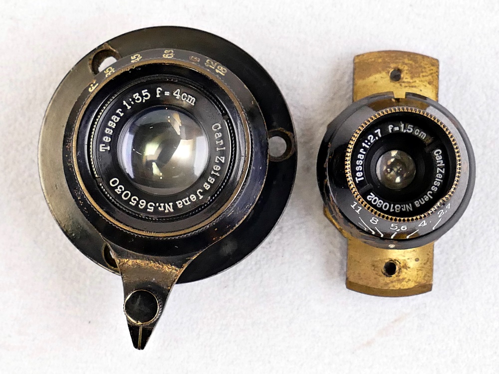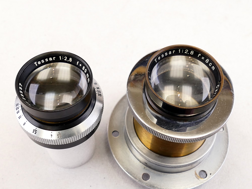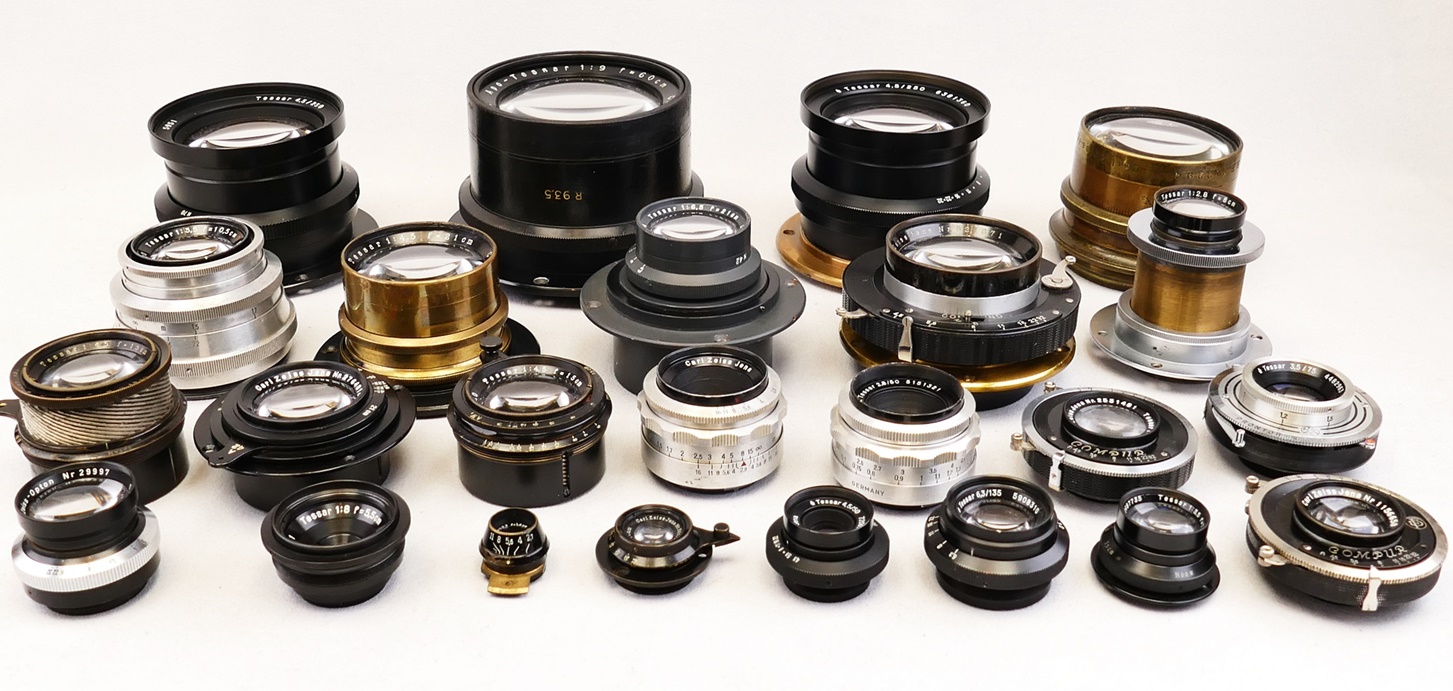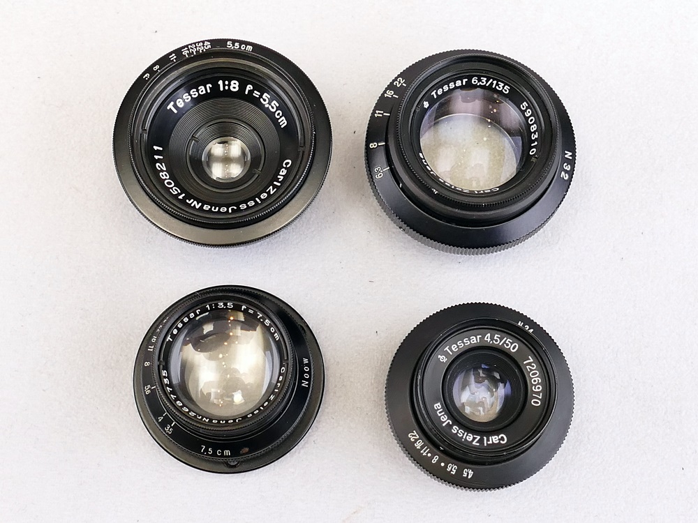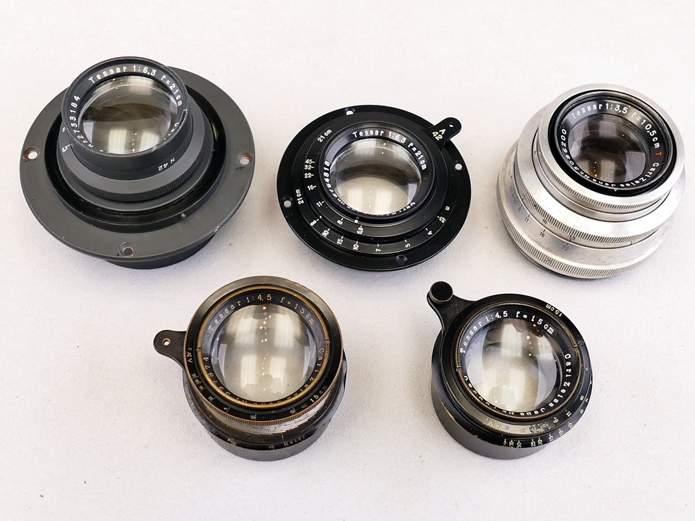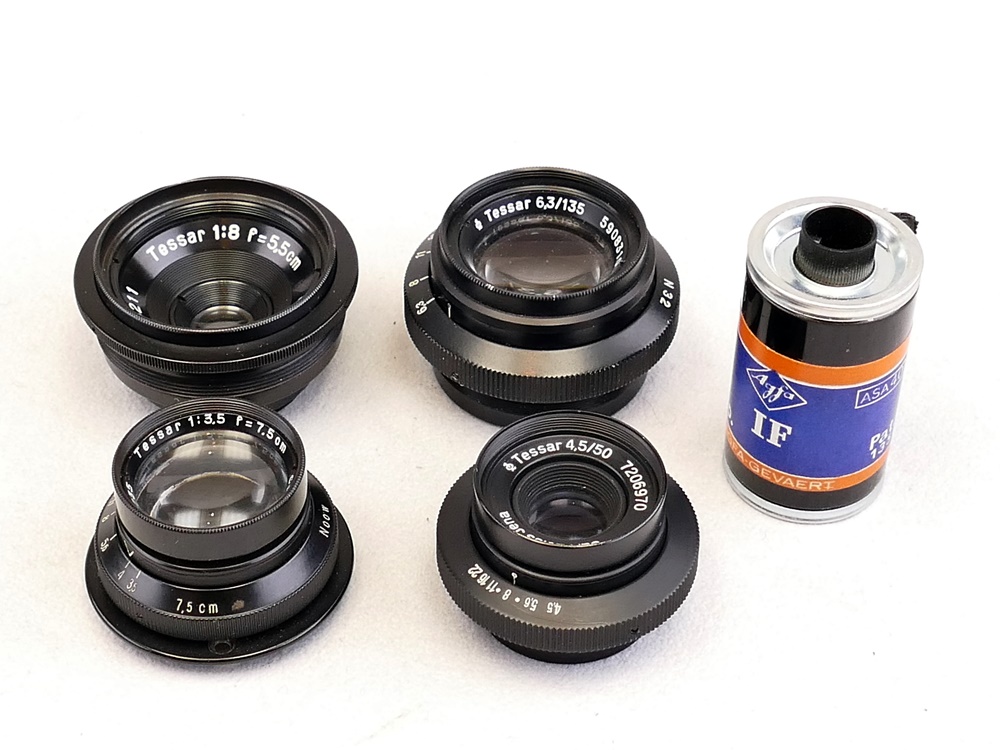 Das vierlinsige Tessar gehört seit 1902 zu den bekanntesten Objektiven und ist auch heute noch überall anzutreffen. Anders als das Heliar ist das Tessar sehr scharfzeichnend, was ihm auch den Namen "Das Adlerauge" einbrachte. Es wurde in verschiedenen Lichtstärken und Brennweiten hergestellt. Hier einige Beispiele aus der Sammlung. Übersicht verschiedener Ausführungen von Tessaren Das Größte mit der längsten Brennweite von 60 cm. Mit zwei 250 mm, baugleich aber völig unterschiedlichen Seriennummern. Rechts zwei frühe Tessare. Bei diesen Tessaren von 1912 und 1913 wurde die Blendenöffnung noch in Millimetern angegeben. Entgegen der späteren Blendenangabe entsprach hier "3" oder "4" der kleinsten Blendenöffnung. Tessare in verschiedenen Bauarten und Brennweiten. Lichtstärken von 8 bis 2.8. Die "Minnis". Links verschiedene Brennweiten mit Lichtstärken von 3.5 - 4.5 - 6.3 - 8 Rechts ein 4 cm 1:3,5 von 1923 und ein 1,5 cm 1:2,7 von ca. 1927/28