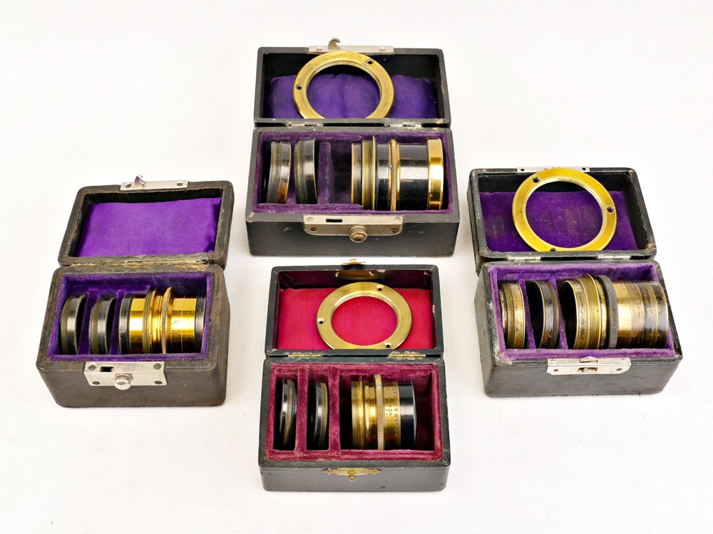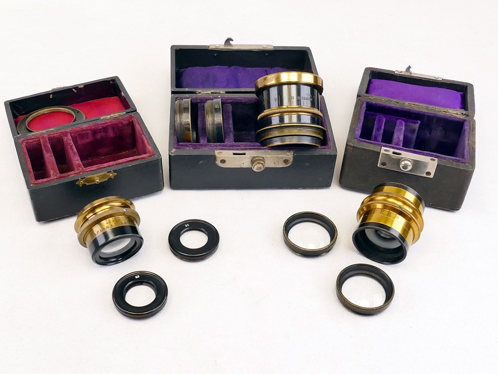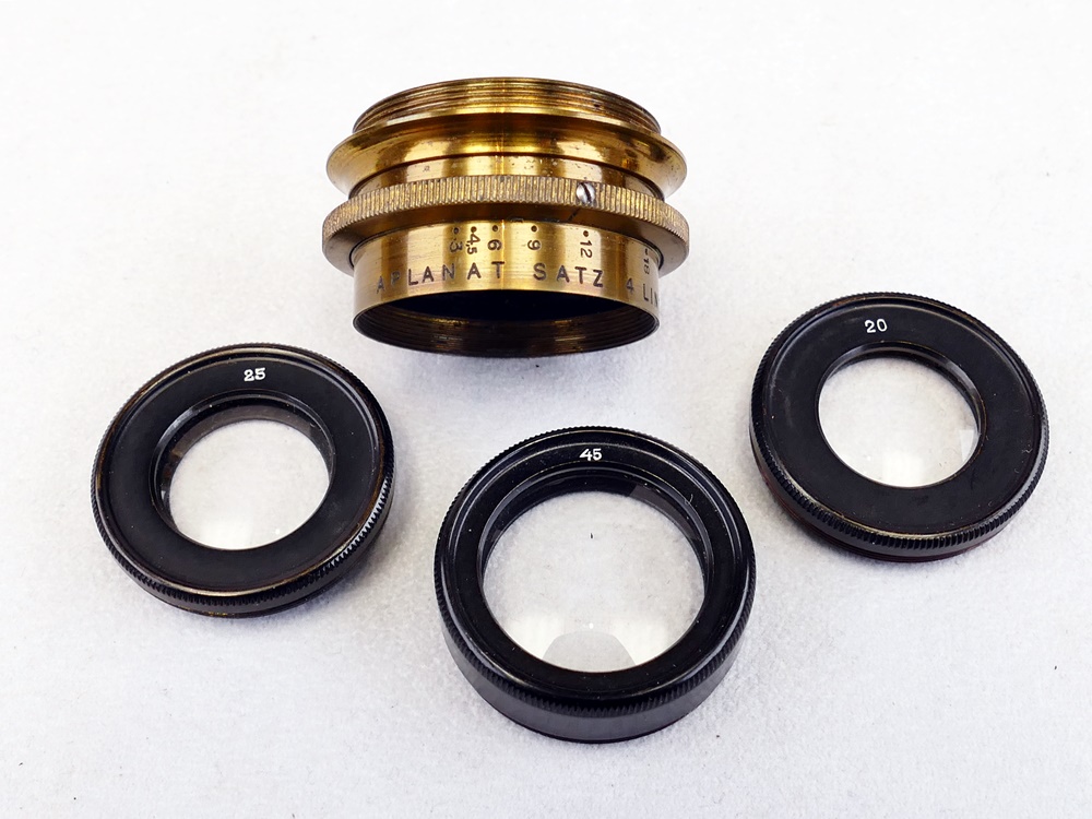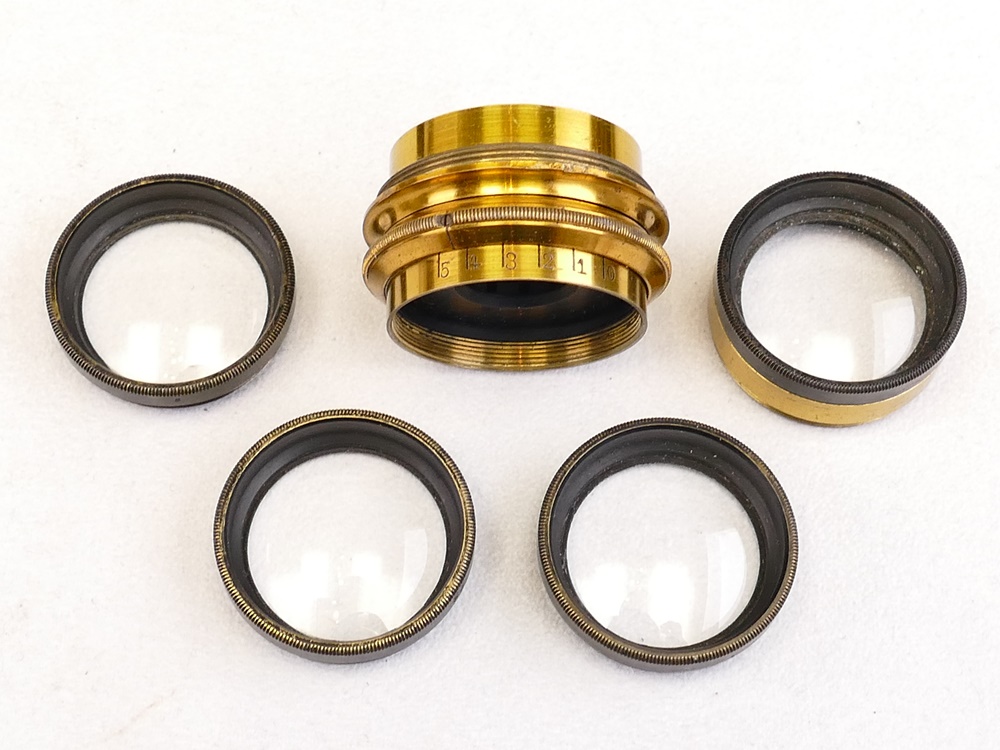 Nicht unerwähnt bleiben soll hier, dass es schon um 1900 Aplanate mit zusätzlichen Linsen gab. Durch Kominationen von Front- und Hinterlinse ließen sich verschiedene Brennweiten erreichen. Diese Sätze wurden seinerzeit in diversen Ausführungen angeboten. Die Blendenangaben wurden hier Verhältniszahlen oder nummeriert von 1 bis 5 angegeben.