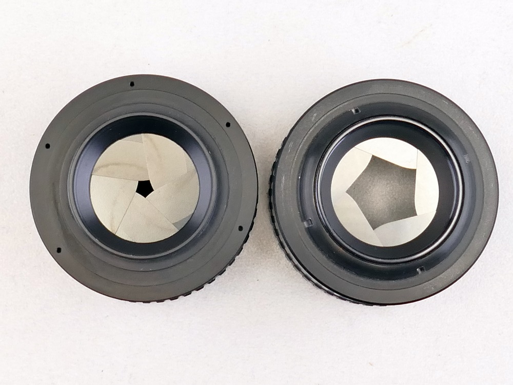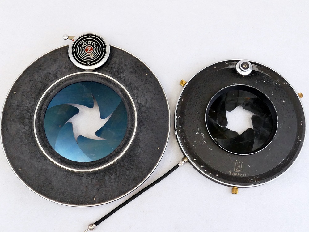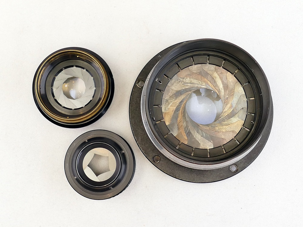 Ausstattung und Zubehör | Die Blenden Die je nach Filmtyp benötigte Lichtmenge bei der Aufnahme wird durch die Blende und die Zeit beeinflusst. In den Anfängen der Fotografie betrug die Belichtungszeit noch einige Sekunden oder gar Minuten. Es reichte den Objektivdeckel für diese Zeit abzunehmen und wieder aufzusetzen. Später wurde das Material empfindlicher und benötigte weniger Lichteinfall. Durch die Blendenöffnung wird die Stärke des einfallenden Lichtes geregelt. Dazu ist die Blende ein wichtiges Merkmal für die Bildgestaltung, indem die Schärfentiefe abhängig ist. Steckblende In der Mitte des Objektives befindet sich ein Schlitz zum Einstecken von Schiebern mit verschiedenen Öffnungen. Die Steck- oder Einsteckblende ist die einfachste Blendenart. Leider fehlen bei vielen historischen Objektiven diese Blenden. Revolverblende Revolverblende: Scheibe mit verschiedenen Öffnungen, die in den Strahlengang eingeschwenkt werden. Diese Blendenform wurde vorwiegend bei kleineren und einfacheren Objektiven verbaut. Meist mittig zwischen den Linsen, bei einfachen Landschaftslinsen auch an der Vorderseite. Irisblende Die am häufigsten anzutreffende Blendenart, die auch heute noch überall verwendet wird. Durch Verstellung von Lamellen wird je nach Anzahl eine stufenlose, fast kreisrunde Öffnung erzeugt. Bild 1 + 2: Irisblenden mit 5, 12 und 19 Lamellen. Bild 3 + 4: Ältere Objektive mit Hebel zur Blendenverstellung. Bild 1: Einstellung der Blende am vorderen Drehring bei vielen älteren Objektiven. Bild 2: Verstellung vorn am Objektiv bei der Schraubleica. Gut ablesbare Scharfentiefe. Hier von 5m bis Unendlich bei Blende 8. Bild 3: Verstellung durch Drehring und mechanische Anzeige der Schärfentiefe bei Hasselblad Objektiven. Bild 4: Sonderobjektive für spezielle Anwendungen mit festen Blendenöffnungen.