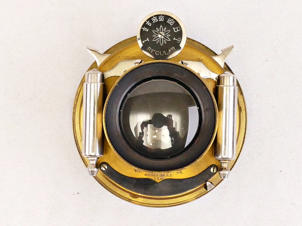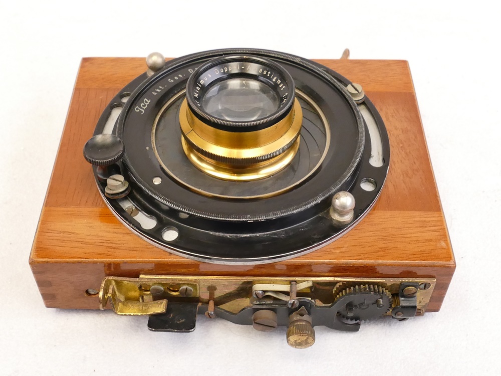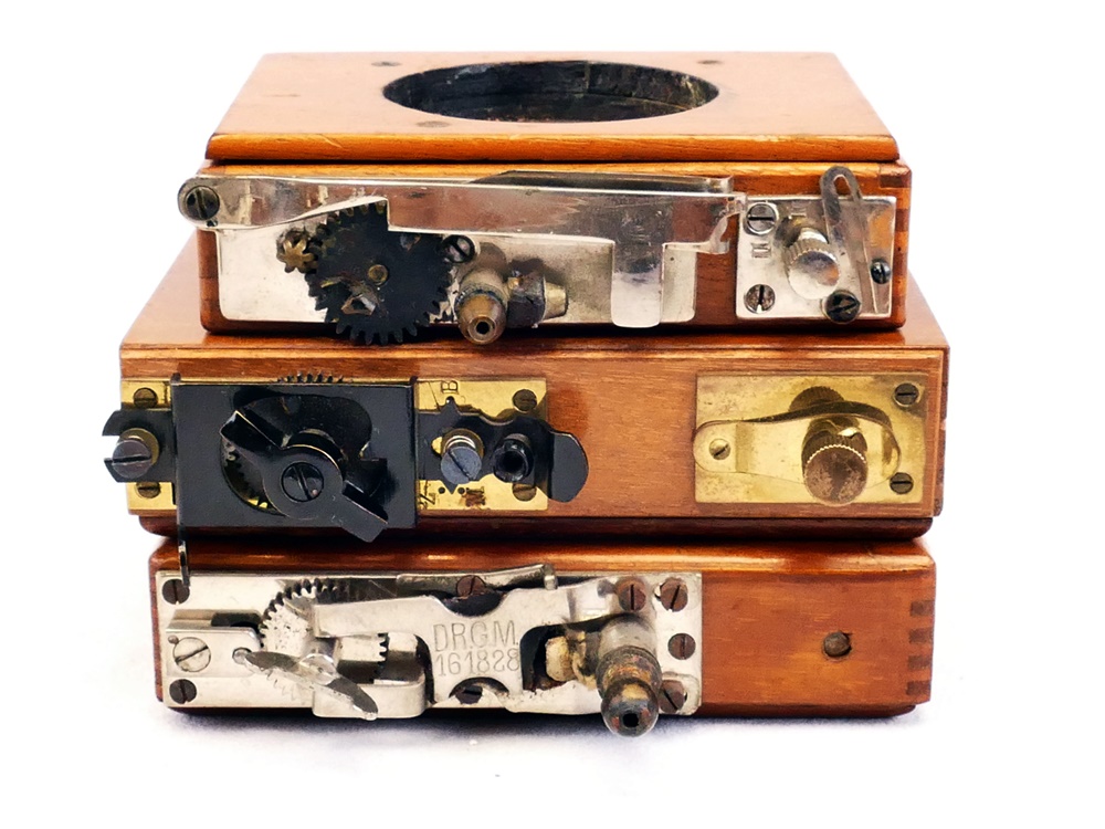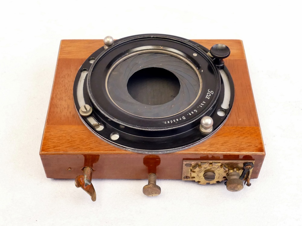 | Die Verschlüsse Für die zeitliche Steuerung bei der Belichtung wurden teils geniale Konstruktionen erfunden. Auch hier sollen aber nur einige Beispiele mit Objekten aus der eigenen Sammlung vorgestellt werden. Für Details und Grundlagenwissen bietet das Internet unzählige Informationen. Einfach- oder Sektorenverschluss Einfachste Verschlussart, bei der eine Scheibe mit Öffnung durch eine Federspannung bewegt wird. Vorwiegend bei einfachen Objektiven und vielen Boxkameras anzutreffen. Oft mit einer Stellung "B" für Daueröffnung.