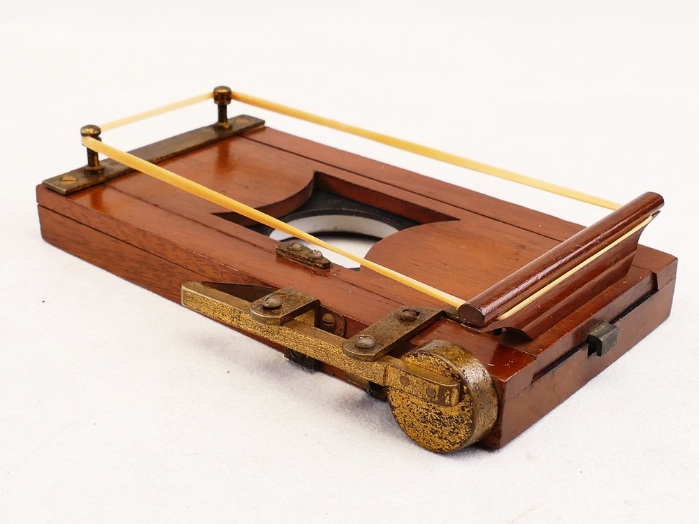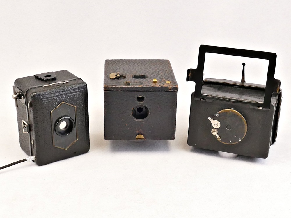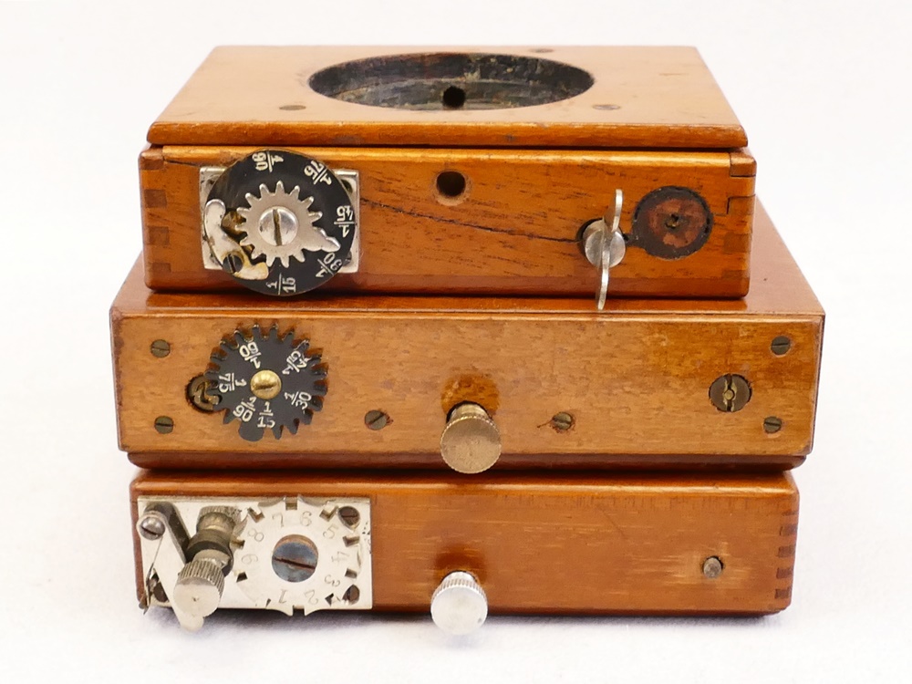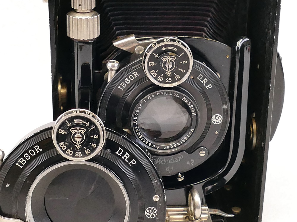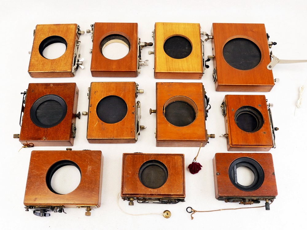 | Die Verschlüsse Für die zeitliche Steuerung bei der Belichtung wurden teils geniale Konstruktionen erfunden. Auch hier sollen aber nur einige Beispiele mit Objekten aus der eigenen Sammlung vorgestellt werden. Für Details und Grundlagenwissen bietet das Internet unzählige Informationen. Einfach- oder Sektorenverschluss Einfachste Verschlussart, bei der eine Scheibe mit Öffnung durch eine Federspannung bewegt wird. Vorwiegend bei einfachen Objektiven und vielen Boxkameras anzutreffen. Oft mit einer Stellung "B" für Daueröffnung.