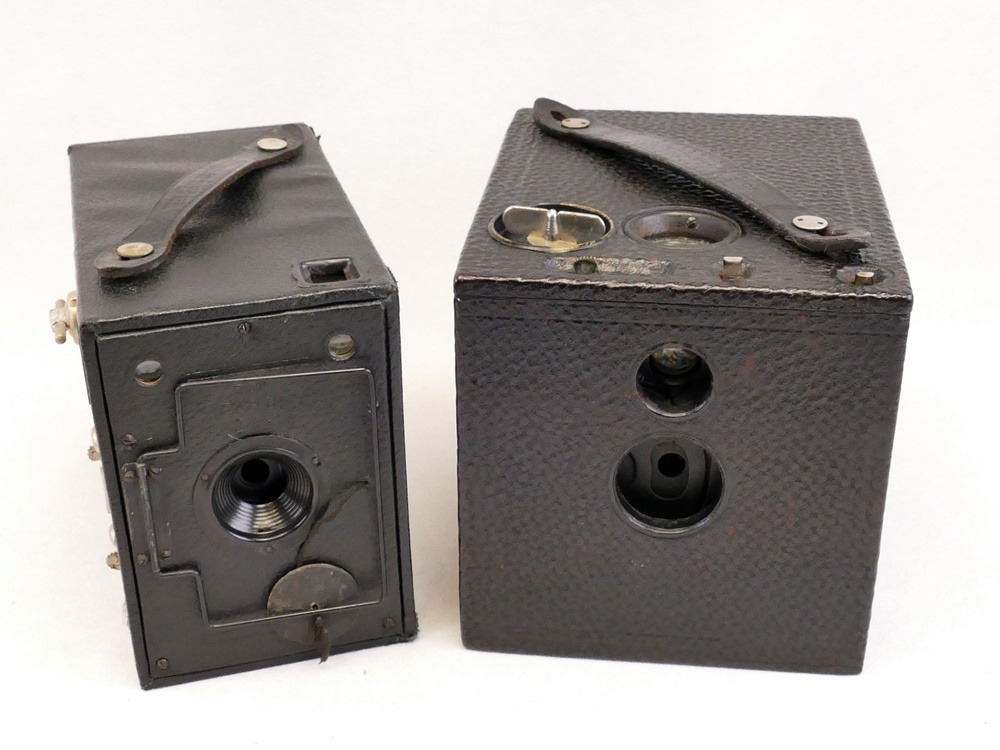 Die Anfänge - kurz belichtet Das Objektiv - laut Wikipedia ein sammelndes optisches System, das eine reelle optische Abbildung eines Gegenstandes (Objektes) erzeugt. Im Prinzip reicht ein kleines Loch aus, um eine Abbildung zu erzeugen - die Lochkamera. Das Fotografieren mit Lochkameras hat auch jetzt noch viele Anhänger. Lochkameras werden immer noch gebaut. Frühe Lochkamera (Eigenbau), und "The Robert Rigby - Long Focus Pinhole Camera" für 5" x 4" Kassetten oder Polaroid. Das mit einem Laser erzeugte Loch entspricht einem Objektiv mit Blende f 246 und einer Brennweite von 90 mm. Die Belichtungszeit beträgt bei 100 ASA/ISO ca. 90 Sekunden. In der Praxis ist aber eine Linse als Objektiv gebräuchlich (Meniskuslinse). Viele Einfach- und Boxkameras sind mit diesen Linsen ausgestattet. Zwei Objektive mit Meniskuslinse. Links mit fester Blende, rechts mit Revolverblende und Segmentverschluss. Gleich 15 Meniskuslinsen sind in der Zeiss-Ikon Briefmarken - Kamera verbaut.
