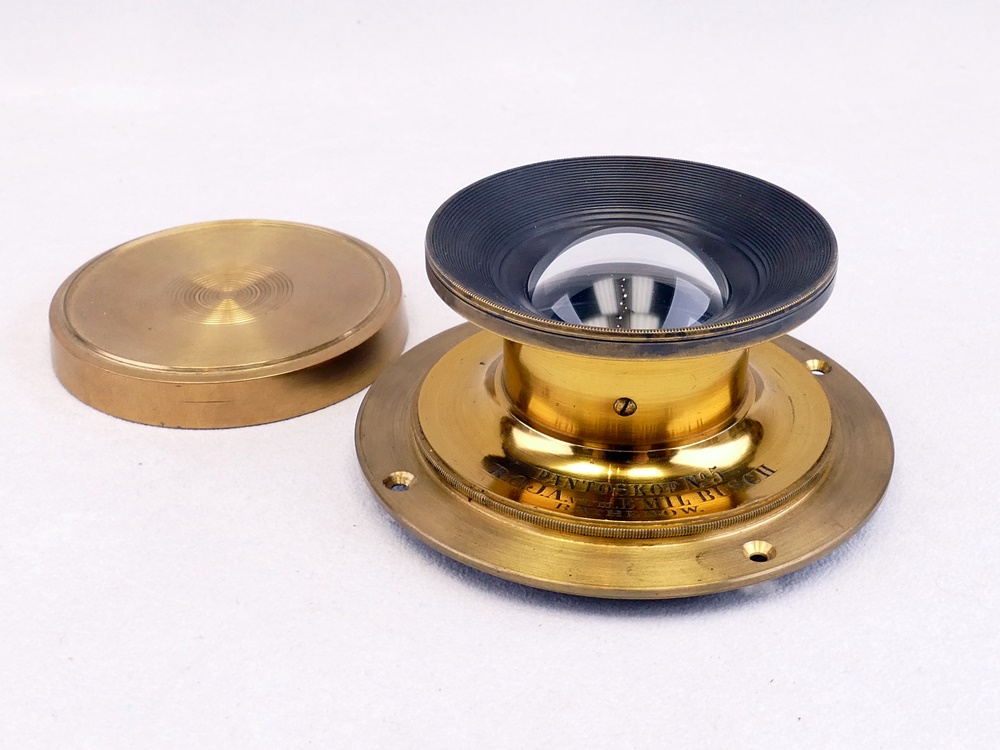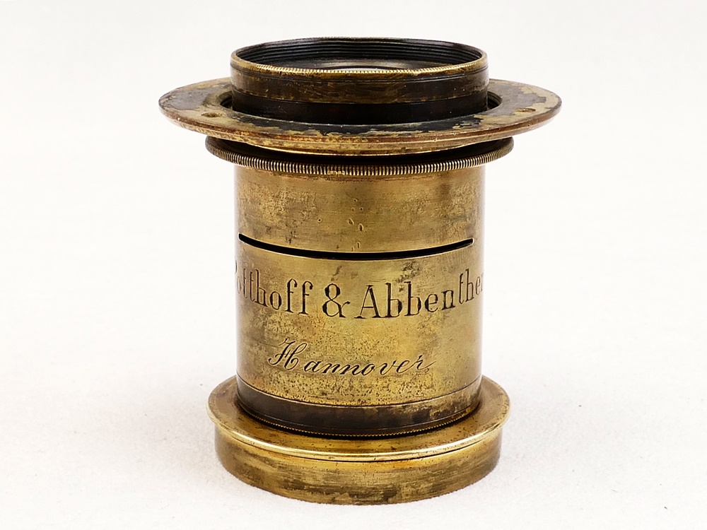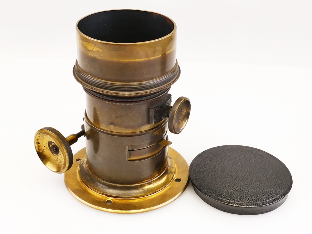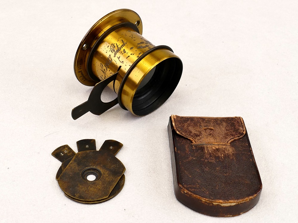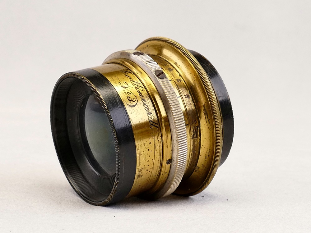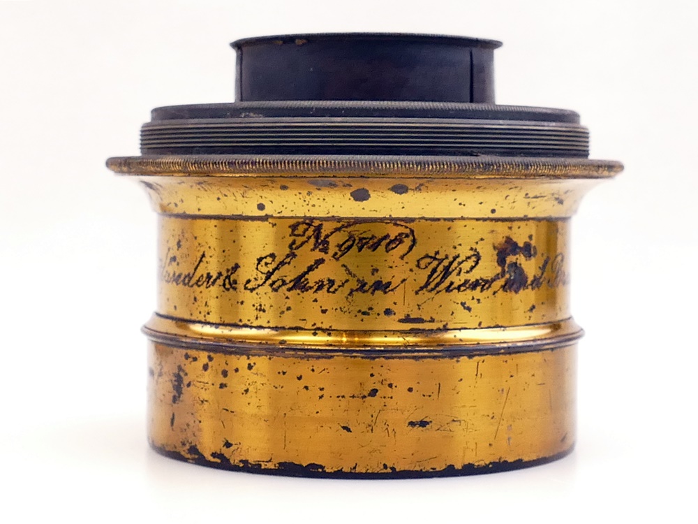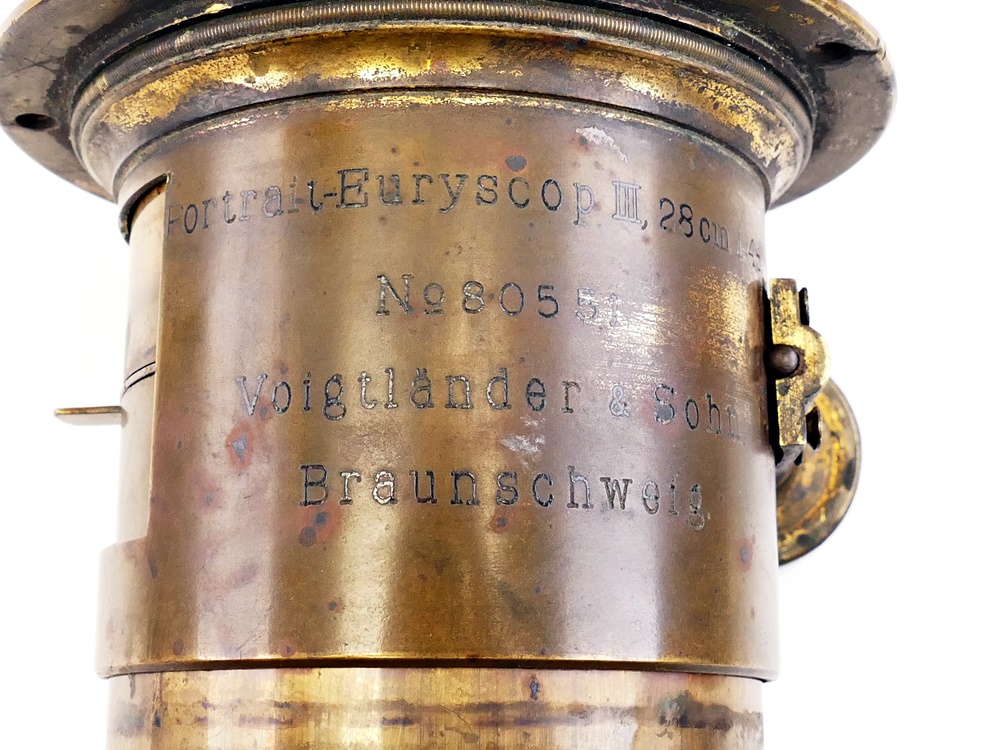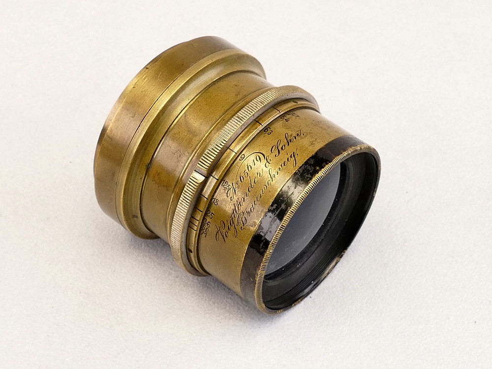 Voigtländer Petzval - Objektiv No. 9761 Länge: 68 mm, Durchmesser 70 mm Belegt ist die Objektiv - Herstellung ab der Fertigungsnummer 27.449 am 12.02.1884. Ab 1849 wurden die Objektive mit "Voigtländer & Sohn in Wien und Braunschweig beschriftet. Anhand der kleinen Seriennummer wurde das Objektiv evtl. schon um 1850 gebaut.