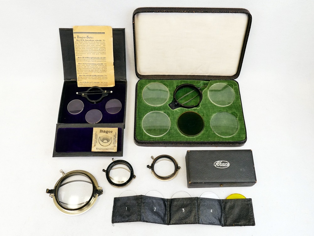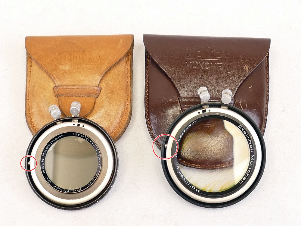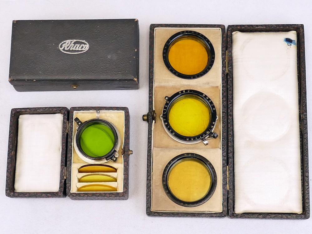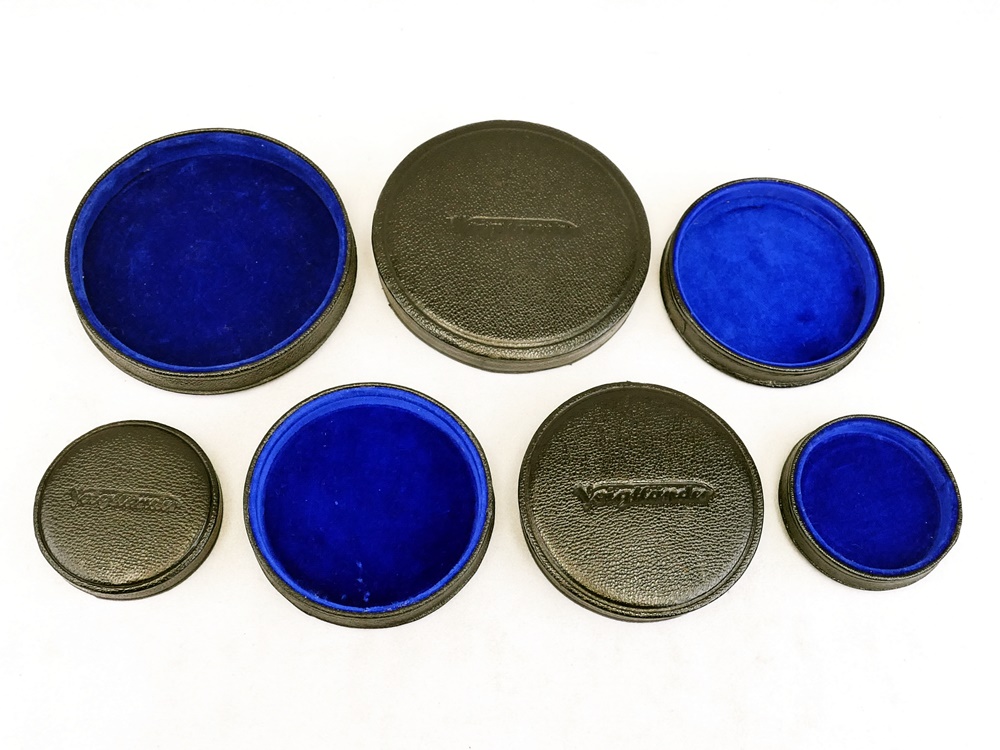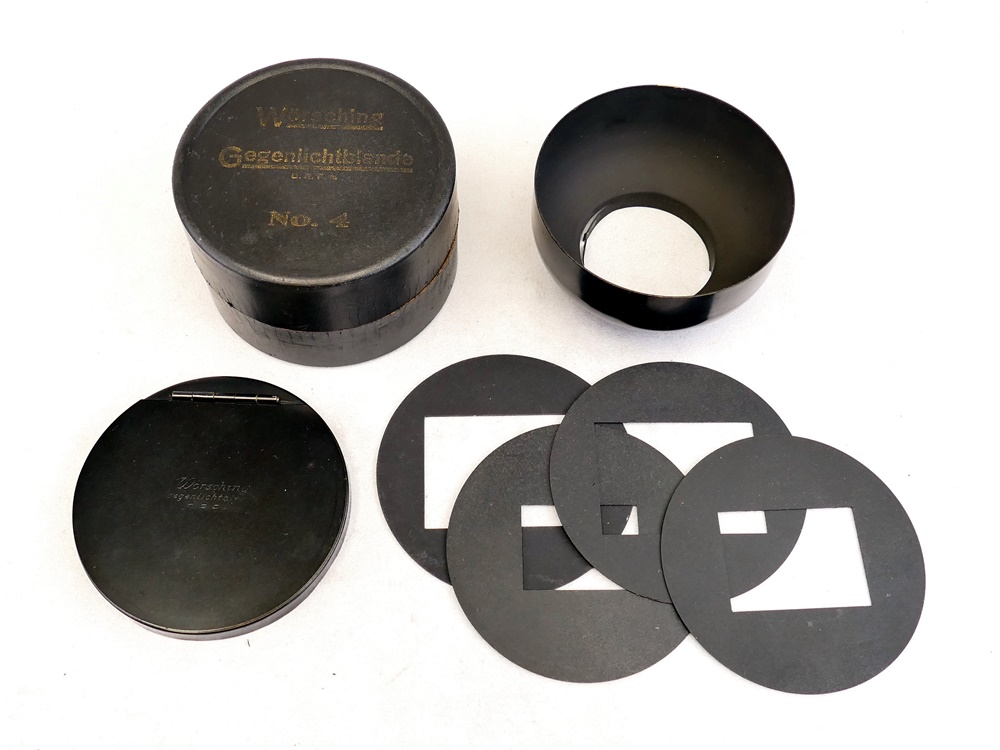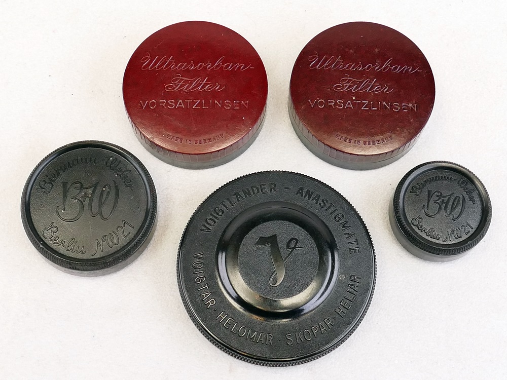 Filter Diverse Filter. Gelbfilter wurden besonders bei Landschaftsaufnahmen verwendet. Auch komplette Sätze waren erhältlich. Eckige Verlaufsfilter, um z.B. nur den Himmel abzudunkeln. Spezielle Weichzeichner - Filter mit konzentrisch eingeprägten Ringen. Sehr schön auch die Bakelit - Dosen der Filter. Nahlinsen und Polfilter Links: Nahlinsen - Sätze für die Verwendung bei veschiedenen Entfernungen im Nahbereich. Rechts: Geniale Konstruktion der Polfilter von Steinheil München. Man schaut von hinten durch das Filter und dreht es, um den besten Effekt festzustellen. Dann drückt man die beiden Hebel zusammen. Die Kleine Kugel (Kreis) rollt nach unten und wird in dieser Position gehalten wenn die Hebel losgelassen werden. Jetzt kann das Filter vor das Objektiv gesetzt werden, ohne den Effekt zu verlieren. Gegenlichtblenden Letztendlich soll noch ein Zubehör - Teil erwähnt werden, dass recht selten für sehr alte Objektive anzutreffen ist. Vielleicht legte man keinen großen Wert auf Gegenlichtblenden oder sie waren bereits Bestandteil des Objektives. Hier sind zwei interessante Objekte. Sehr schöne und wirksame Gegenlichtblende mit Klappe und Formatmasken im Originalkarton. Klappbare Lederblende, die auch als Schutz auf dem Objektiv verbleiben kann. Machen wir einen Deckel drauf Ein leider vernachlässigtes Zubehörteil ist der Objektivdeckel. Viele Objektive wären in einem besseren Zustand, wenn sie öfter einen Schutz getragen hätten. Dabei sind die Deckel der frühen Objektive durchaus sammlungswürdig. Frühe Deckel, oft Pappe beledert oder geprägt. Einige Objektive hatten auch massive Messingdeckel. Besonders hochwertig und aus massivem Leder sind die Voigtländer - Objektivdeckel. Innen mit wunderschönem Samt gefüttert.